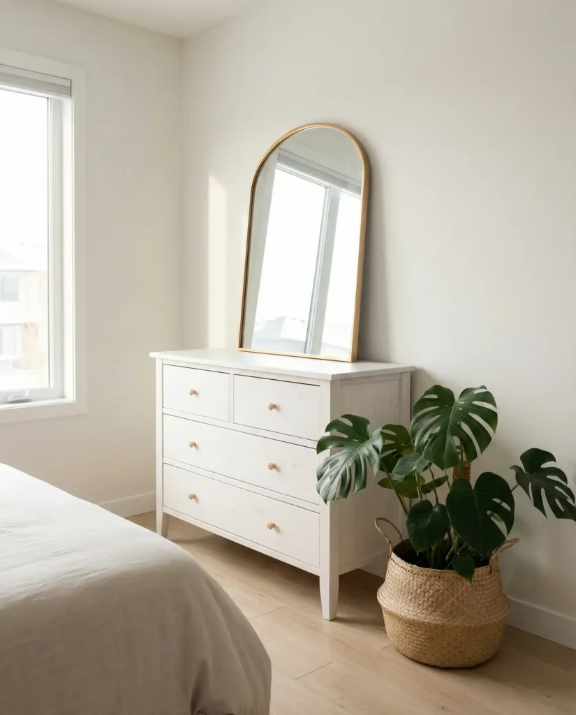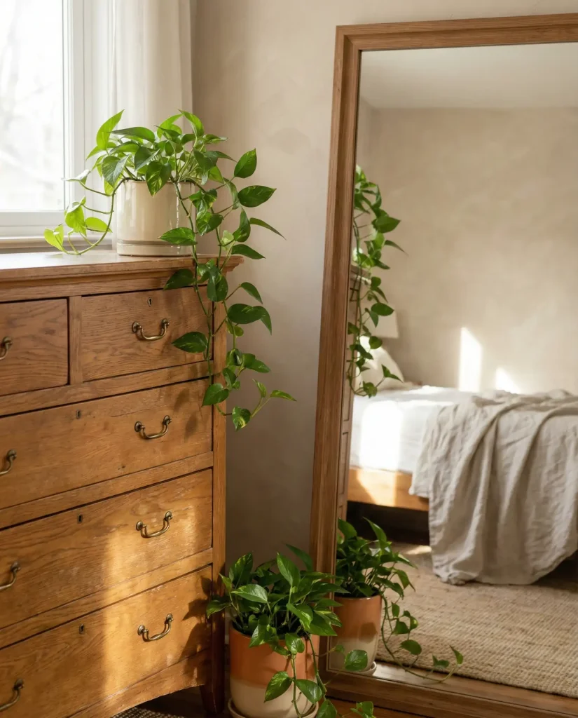 A large leaning mirror paired with trailing potted plants creates instant depth and life atop any dresser. This approach works beautifully in bedroom spaces where natural light bounces off reflective surfaces, making smaller rooms feel larger. The aesthetic leans effortlessly modern, yet the organic textures keep it grounded and warm. Choose a mirror with a thin black or wood frame to anchor the look without competing with your greenery.