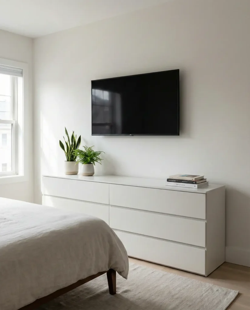 Mounting your tv on the wall directly above the dresser creates a clean, floating effect that maximizes floor space and gives your bedroom with a mounted TV a streamlined, modern feel—especially popular in urban apartments where every square foot counts. The dresser below then becomes pure storage and styling real estate, free from the visual weight of a screen sitting on top. Run cables through the wall or use a cord cover to keep everything tidy, and style the dresser with low-profile items that won’t block the screen or create glare.