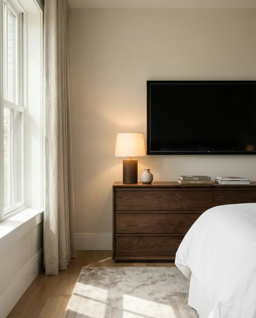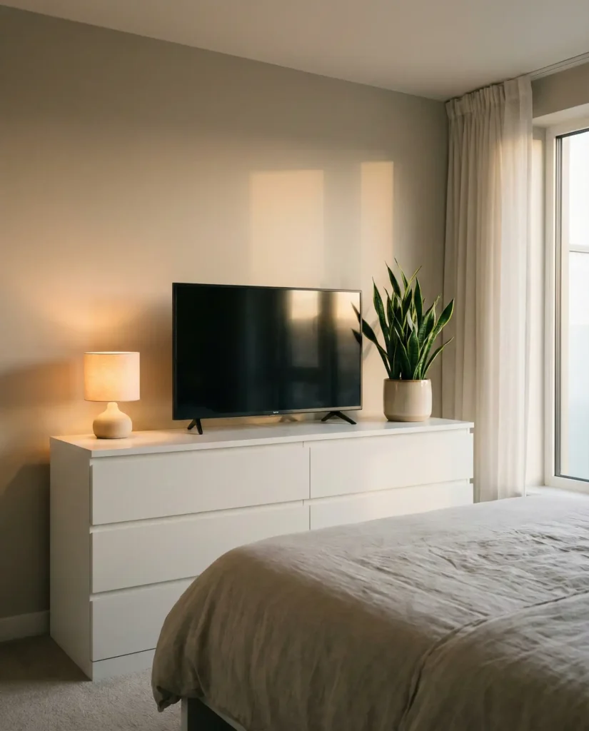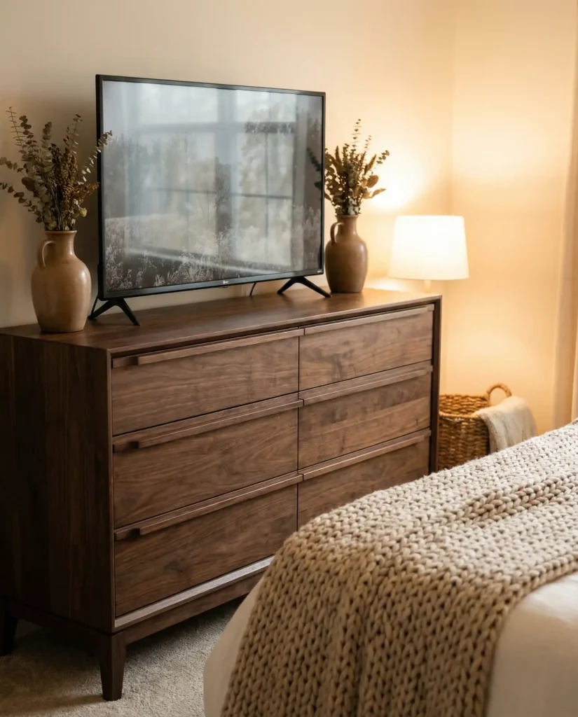 In urban apartments, especially studio and one-bedroom layouts, this setup eliminates the need for a separate TV stand and frees up valuable floor space for seating or storage. Make sure your dresser height puts the screen at a comfortable eye level when you’re in bed—typically around 42 to 48 inches—to avoid neck strain. It’s a small ergonomic detail that makes a big difference in everyday comfort.
