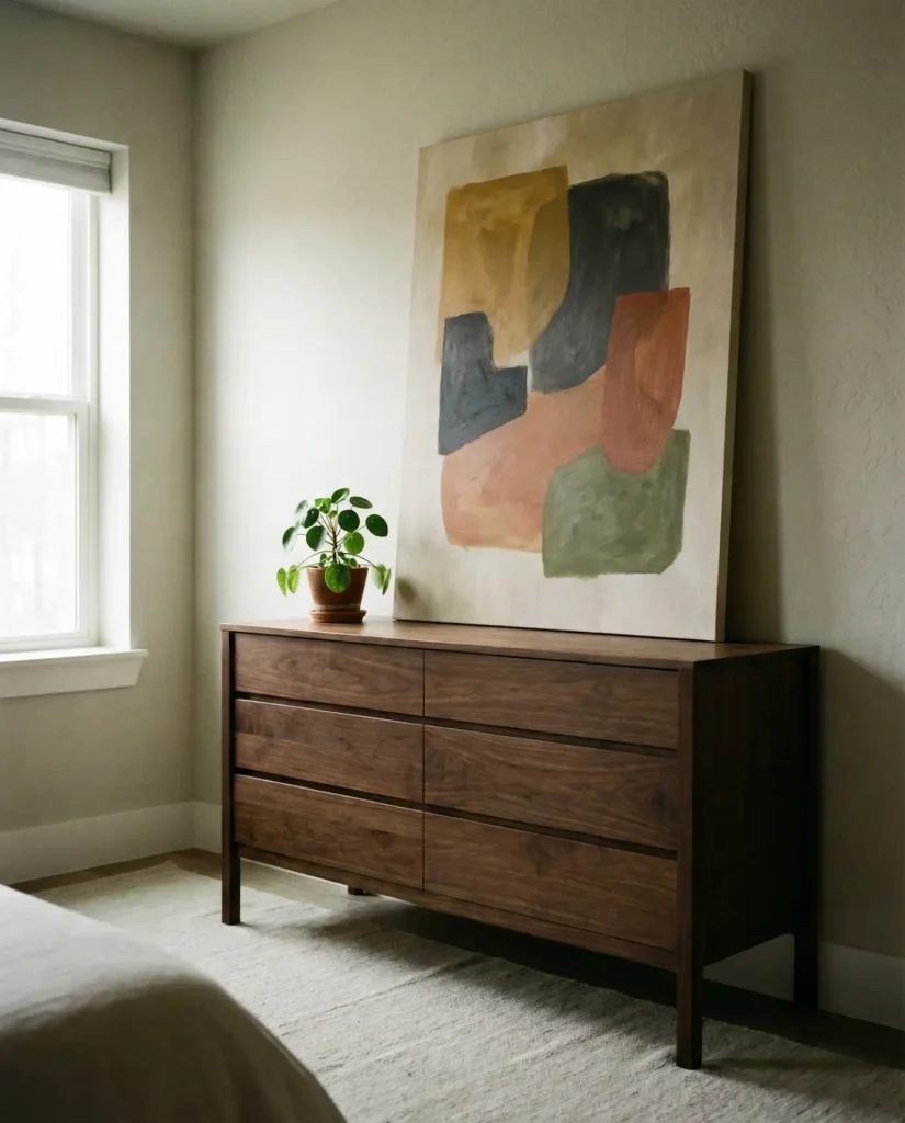 Propping a large canvas or framed print against the wall atop your dresser delivers instant drama and a collected, lived-in vibe that feels more “art collector” than “mass retail.” This works beautifully on long dressers where you have the horizontal space to let a piece breathe, and it’s a favorite among renters who want impact without the commitment of hanging heavy frames. Choose abstract work, photography, or even a vintage poster that echoes colors elsewhere in your bedroom.