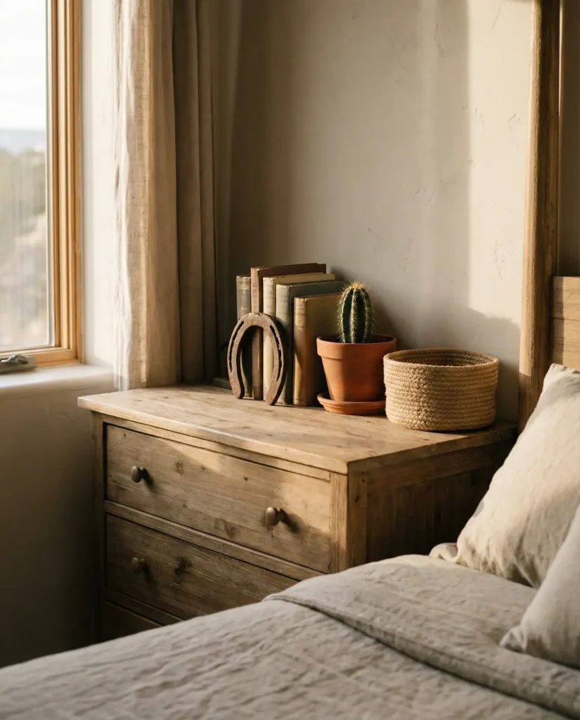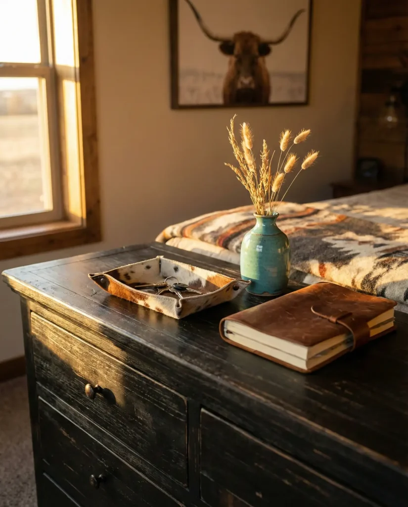 Bringing in Western-inspired elements—cowhide, turquoise accents, leather-wrapped vessels, or a vintage wagon wheel—adds rugged personality to your dresser and taps into the enduring Americana aesthetic that’s having a major moment in interior design. This look thrives on contrast: pair a rough-hewn wooden tray with a delicate ceramic vase, or a leather-bound book stack with a soft linen runner. The goal is “collected ranch” rather than costume party, so edit ruthlessly and let each piece have room to breathe.