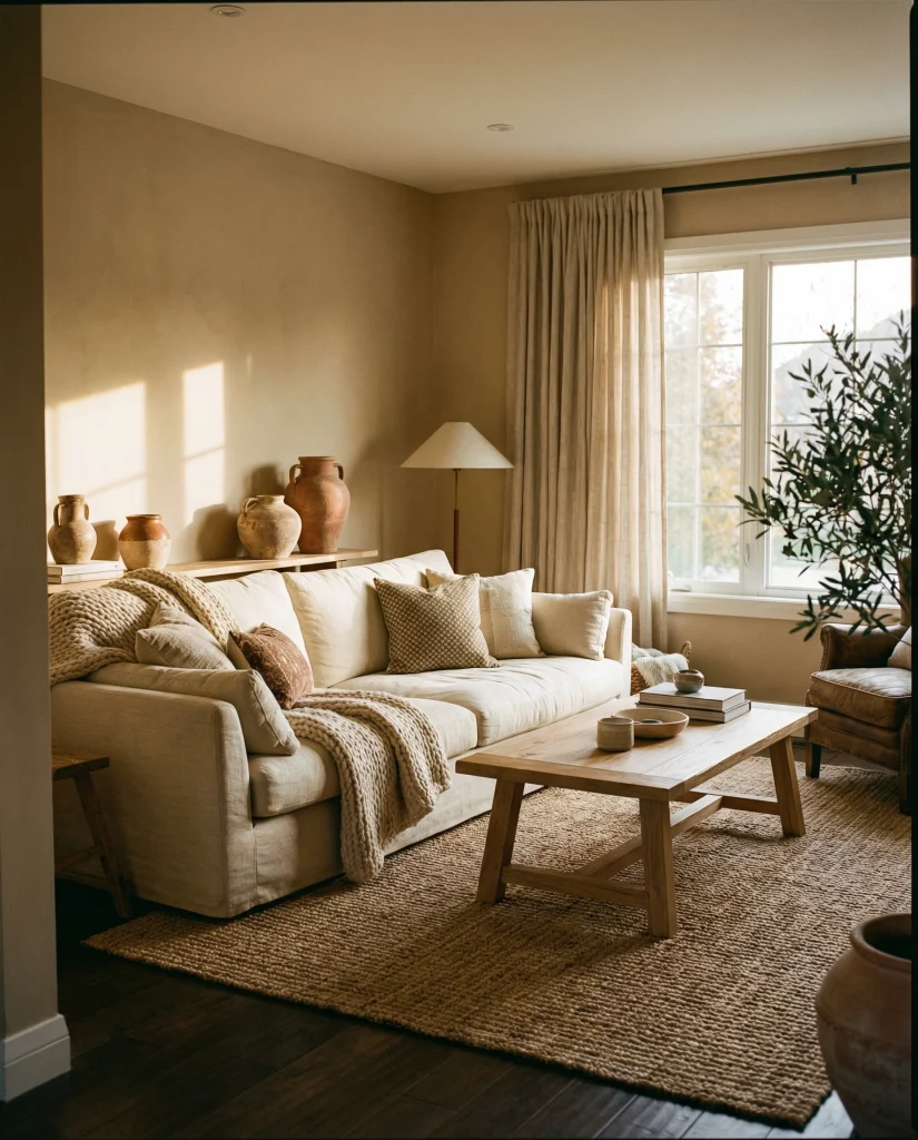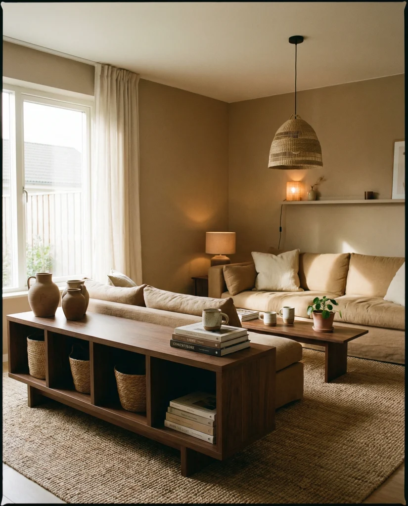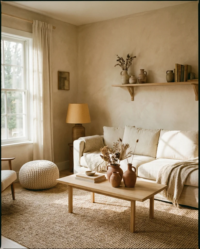 A soft neutral palette paired with simple shapes and cozy details creates a calm, earthy living room that feels breathable and warm. The focus is on clean silhouettes, gentle textures, and subtle tonal shifts that bring serenity into everyday living. This idea works beautifully for those who appreciate design restraint.