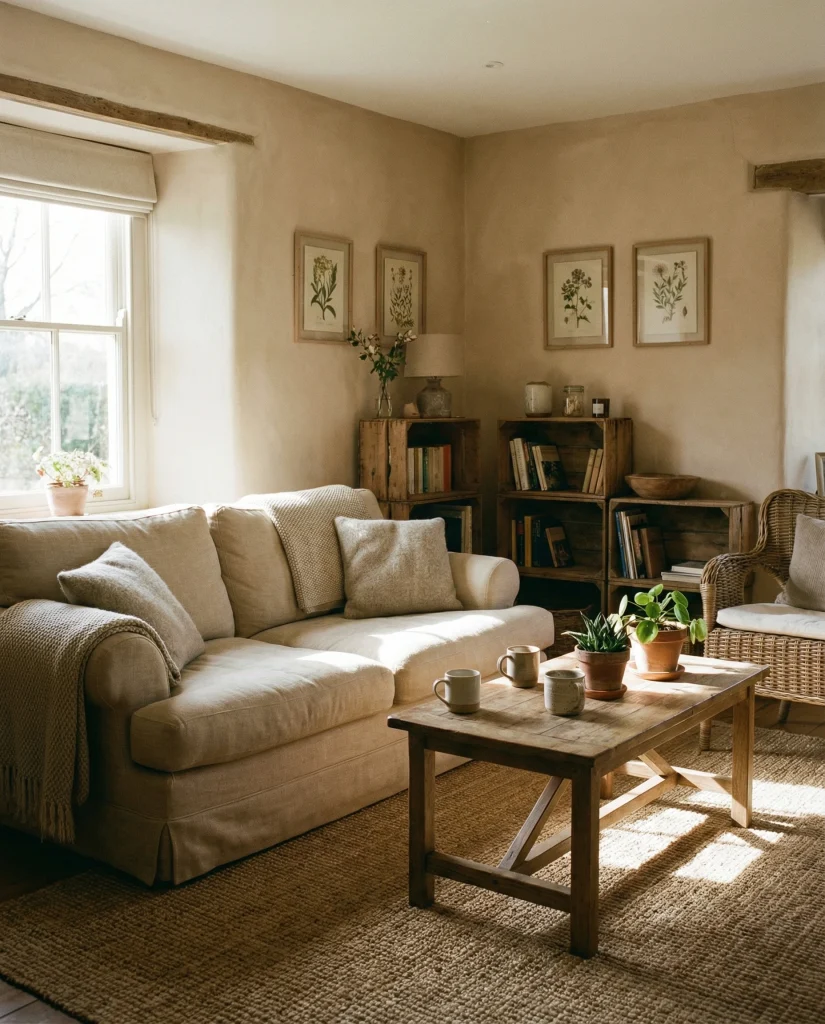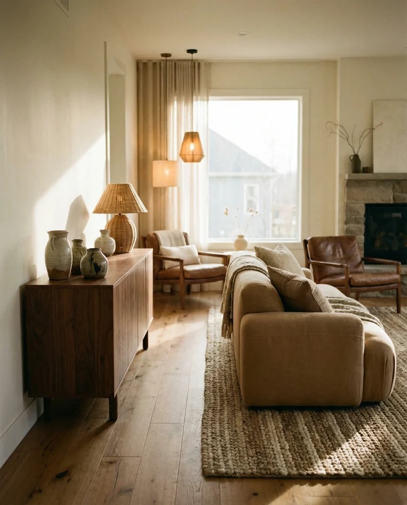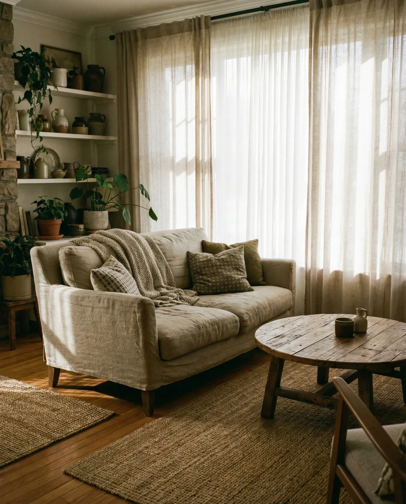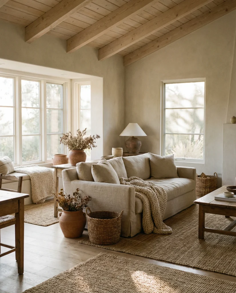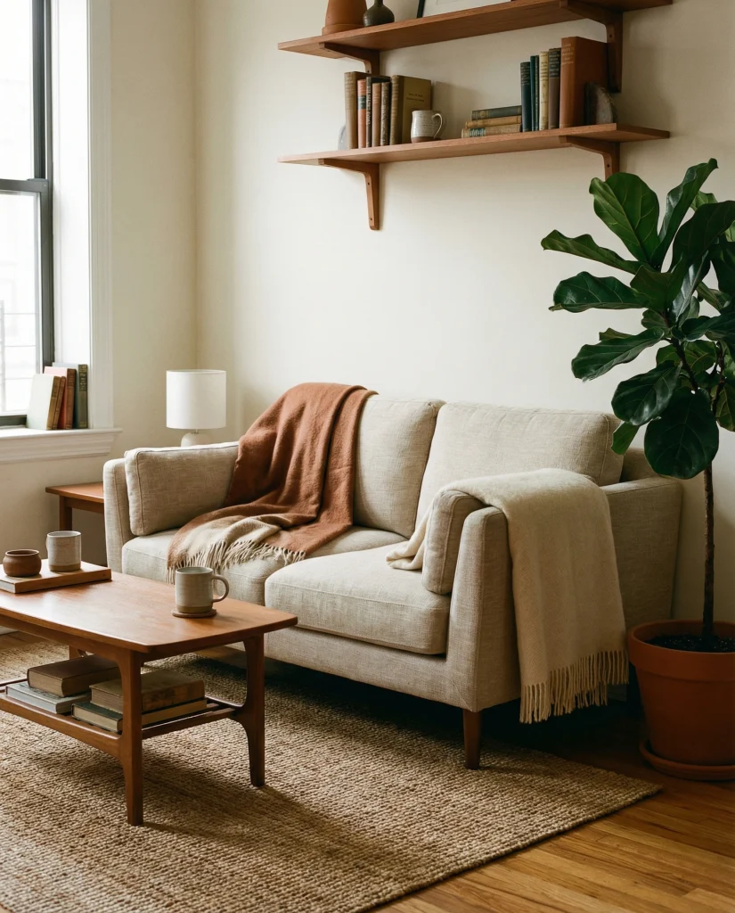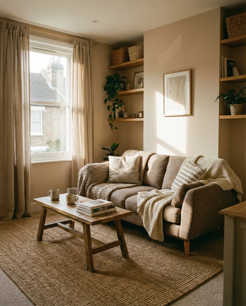Designing for small spaces while incorporating cozy earth textures means choosing scaled-down furniture, warm neutrals, and low visual weight. Light woods, subtle patterns, and soft fabrics make compact living rooms feel open yet warm.