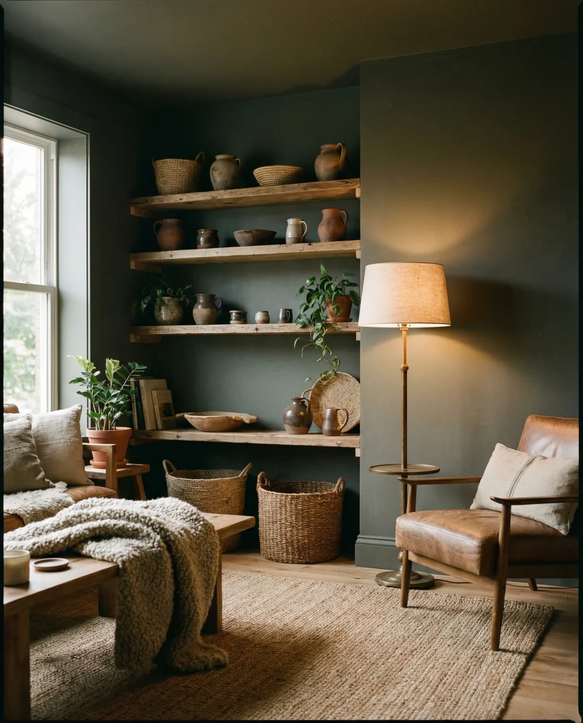 Introducing deeper tones through a dark palette and subtle natural textures creates an earthy living room with a grounded mood. This idea blends rich wall colors, matte finishes, and warm accents to deliver a feeling of quiet sophistication without overwhelming the space. It works especially well in homes that embrace natural materials.