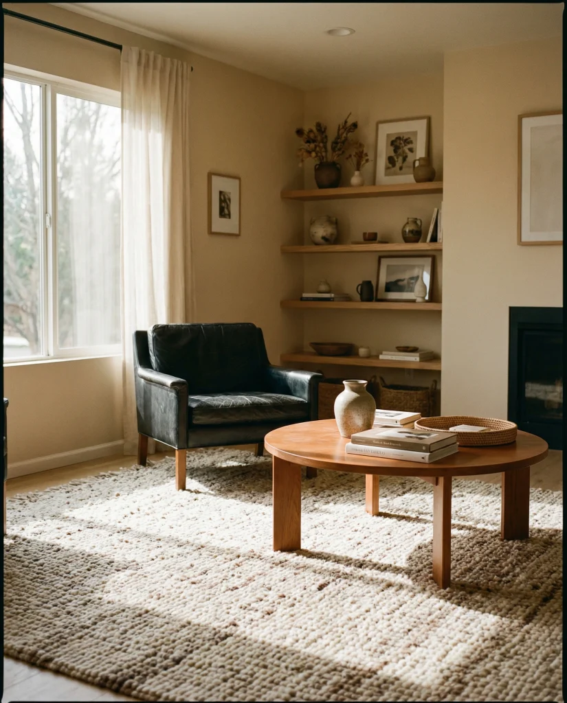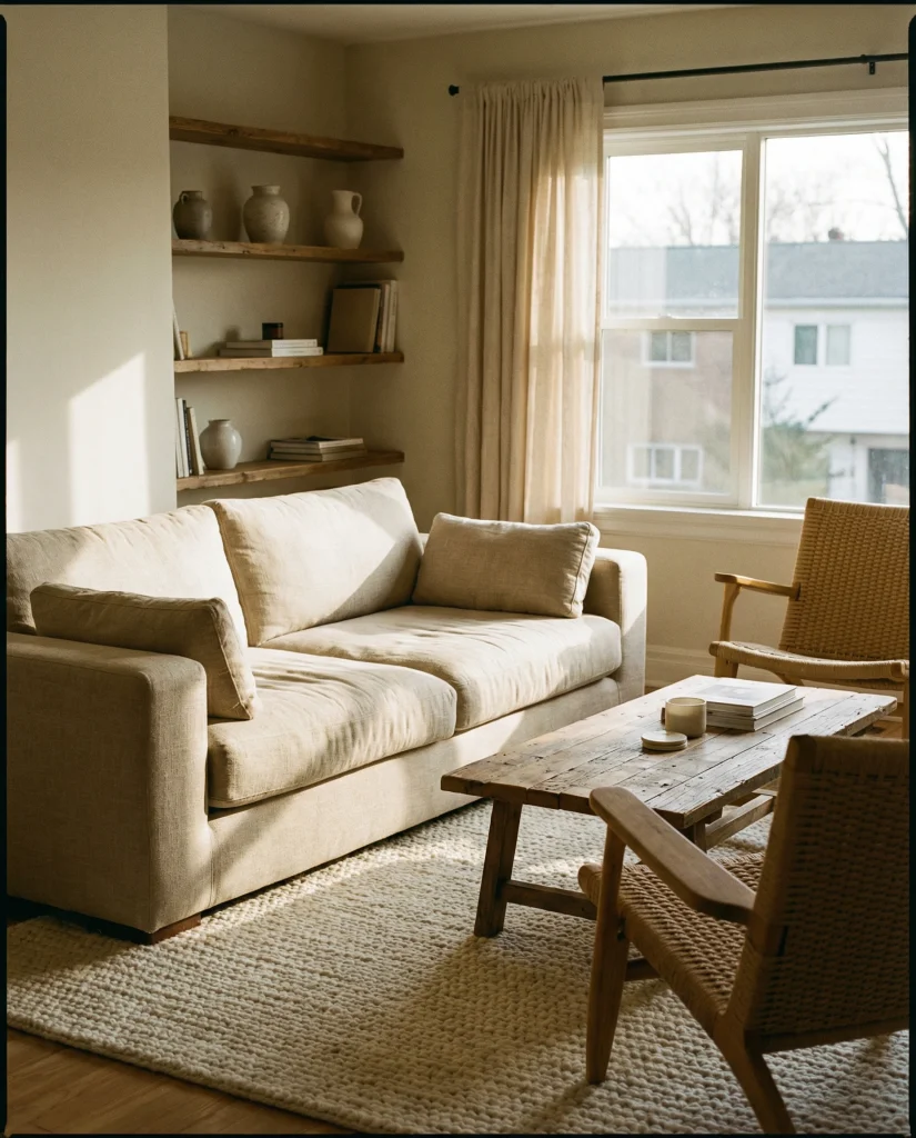 Prompt: simple neutral living room with beige sofa, soft wool rug, wood accents, minimal decor, warm natural light, pinterest-ready aesthetic, no people