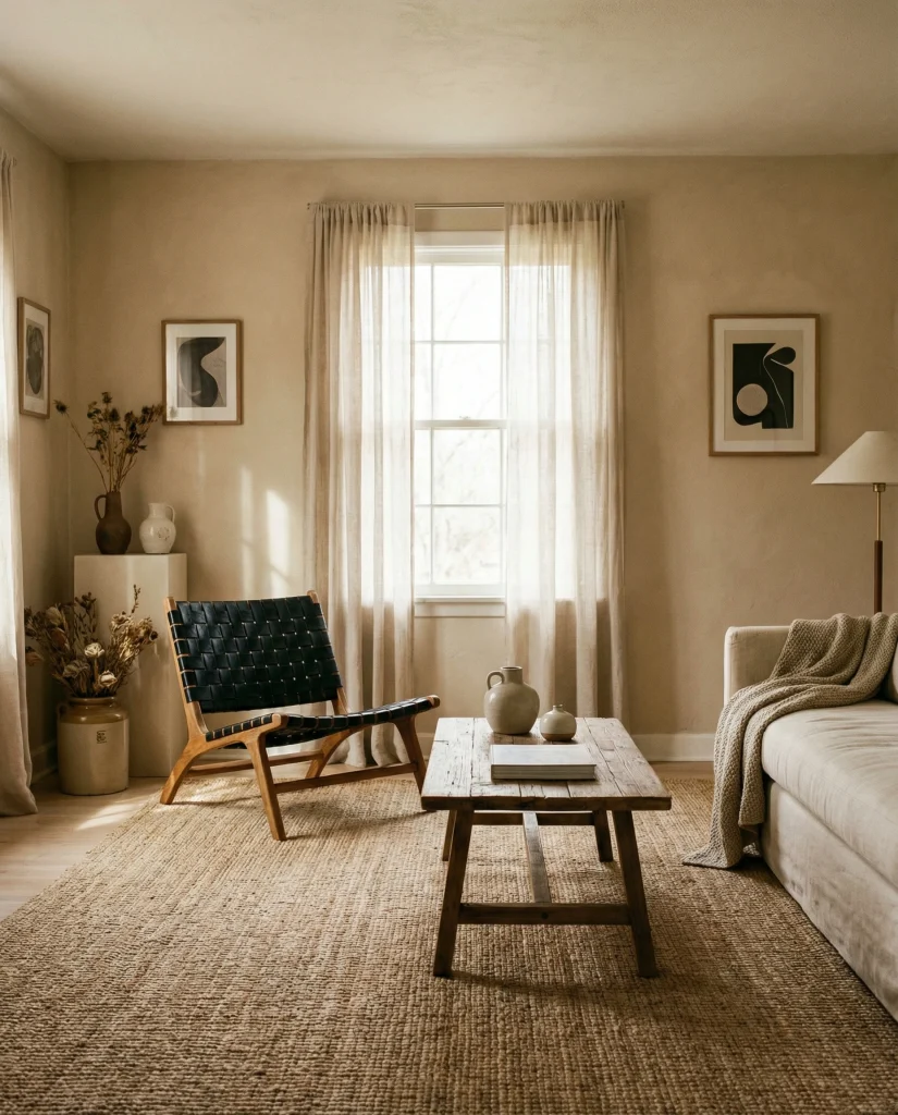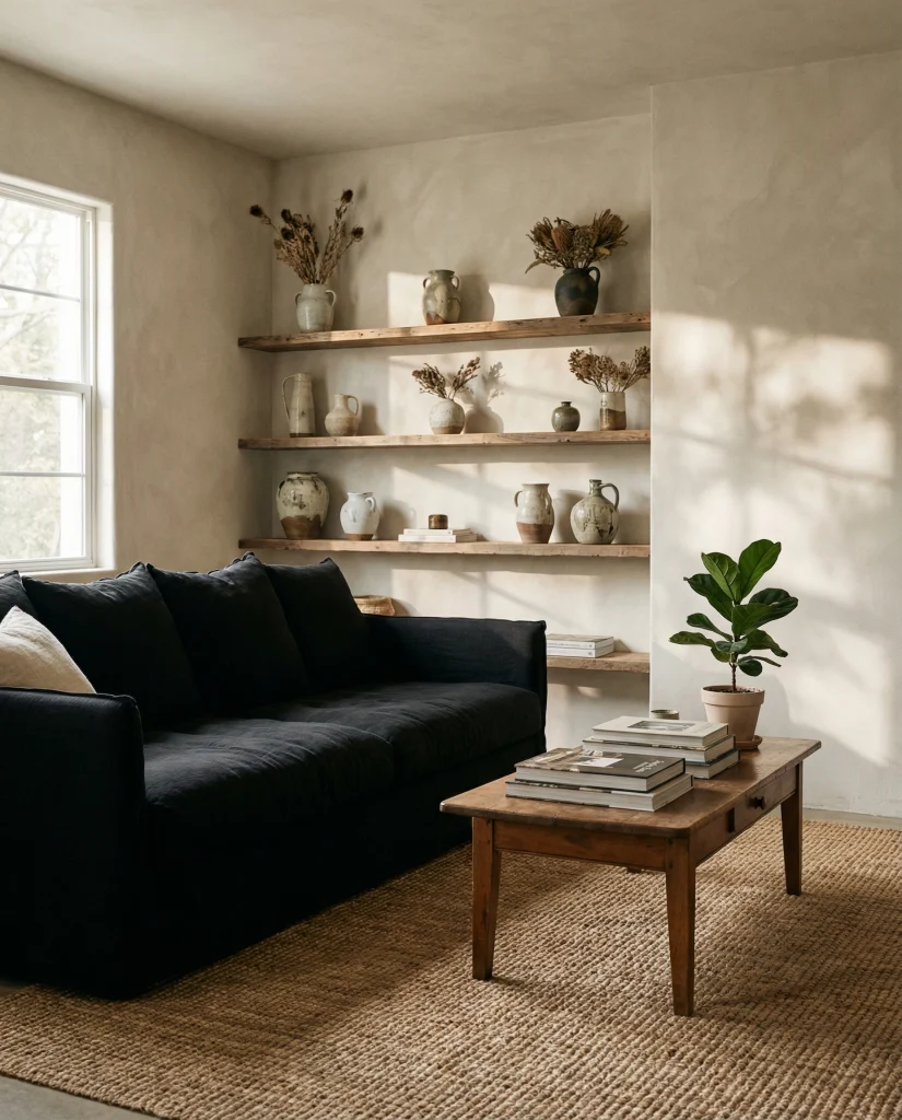 Common mistake to avoid: using too many black elements, which can tip the balance toward harshness. Limit dark accents to a few focal points so the earthy textures remain dominant.
