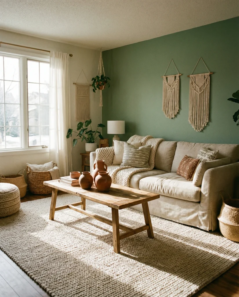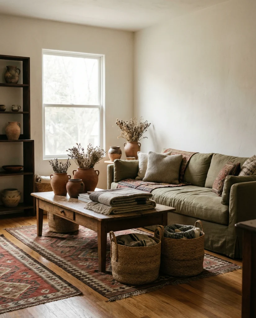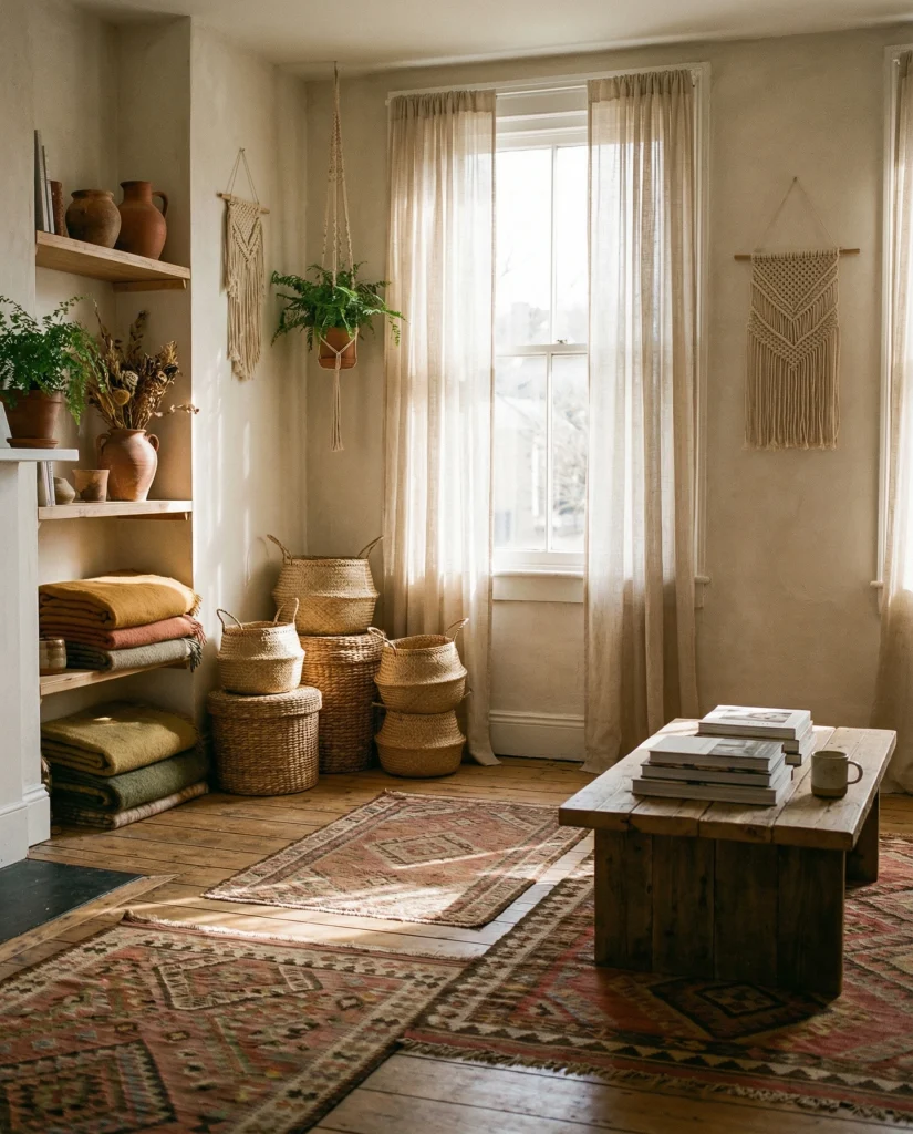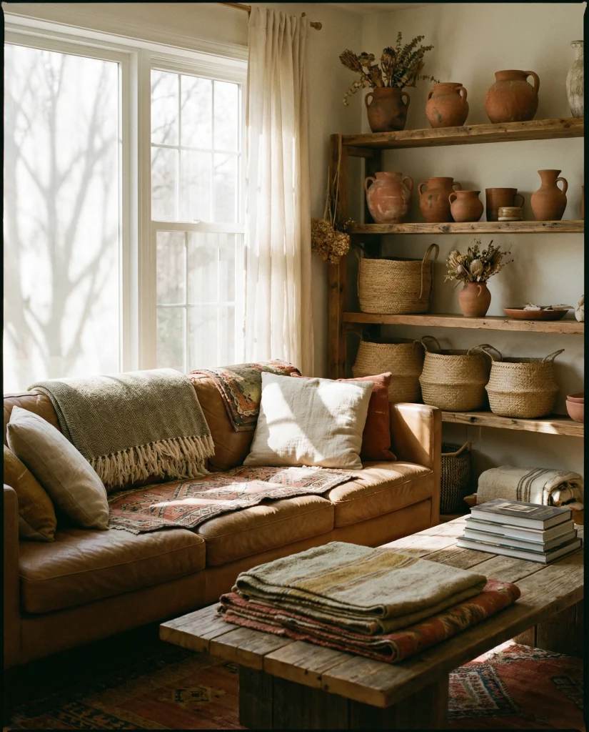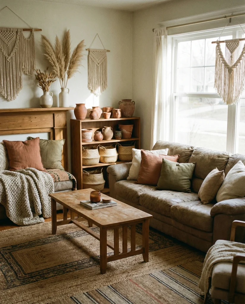 Earthy living rooms blend easily with Bohemian accents and natural materials like woven baskets, artisanal textiles, and globally inspired patterns. This layered look feels collected over time, rich in texture, and deeply personal without relying on bold colors.
