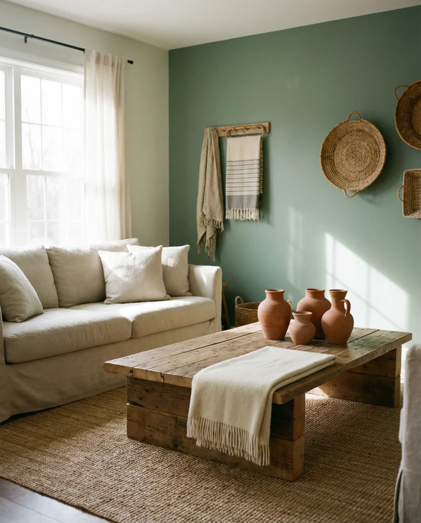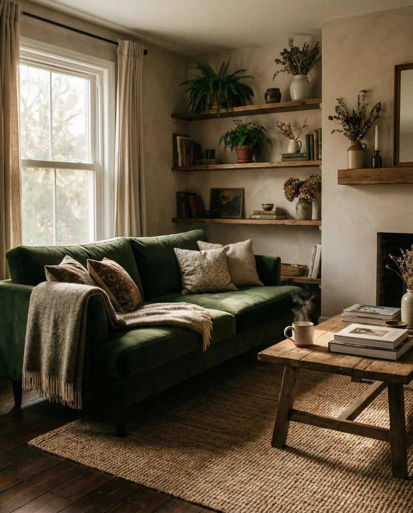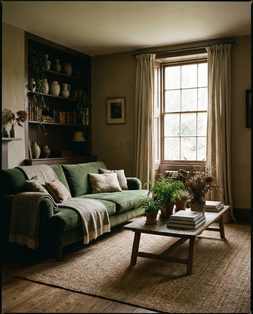 Deep botanical shades paired with a green couch or subtle moody accents introduce richness while staying rooted in nature. These colors mimic forest tones, adding drama without the heaviness of charcoal or navy. When balanced with warm neutrals, the palette feels serene and enveloping.