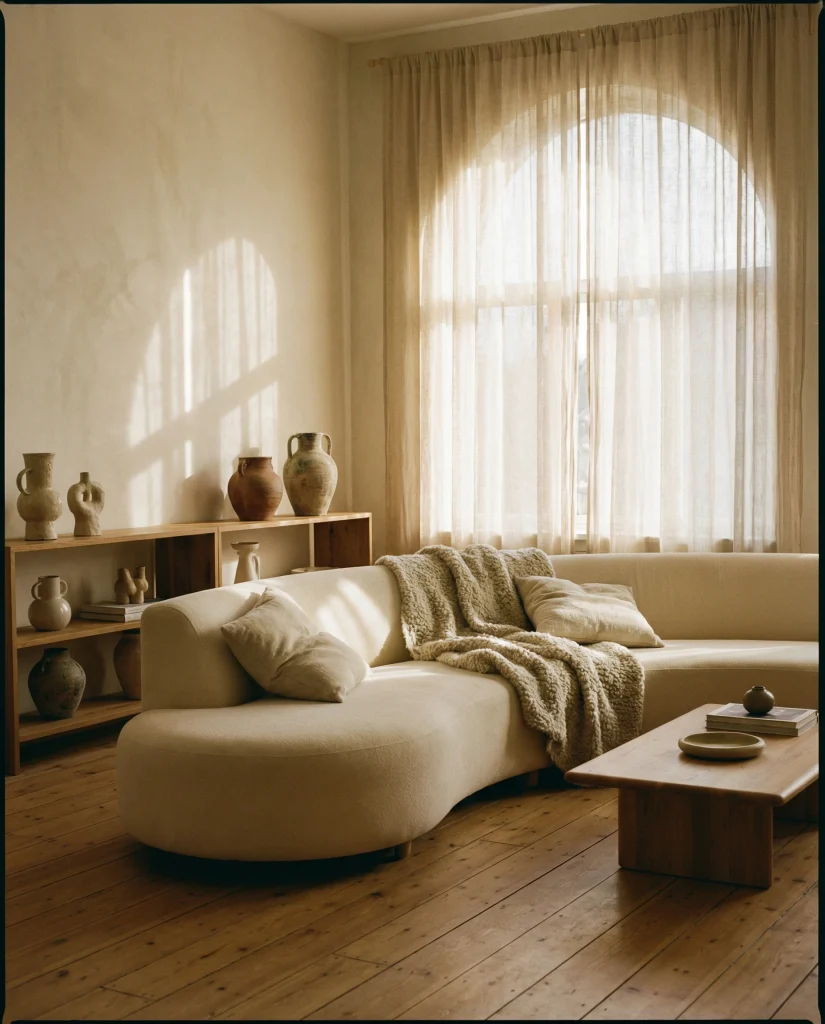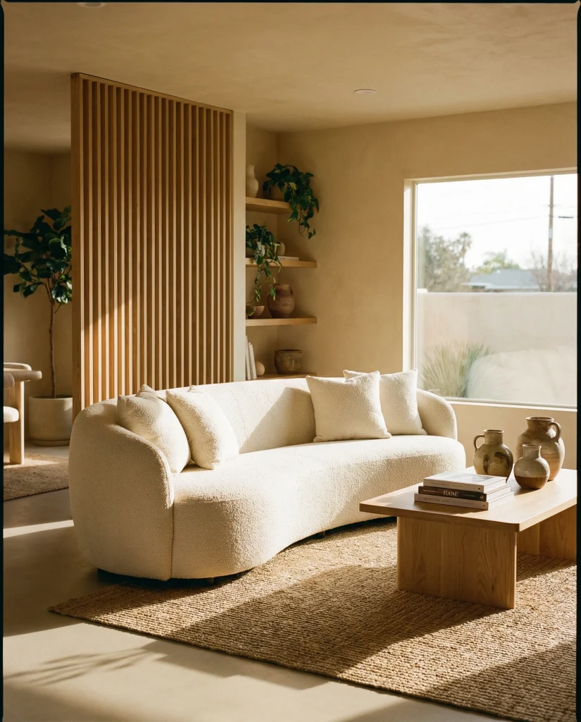 The blend of organic modern curves with muted earthy tones creates a soft, sculptural living room that feels contemporary yet soothing. Rounded forms, matte finishes, and warm natural materials work together to create a space that feels calm and thoughtfully designed.