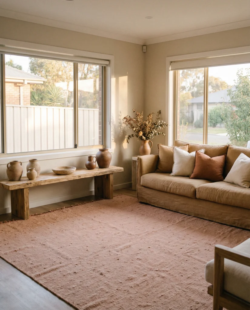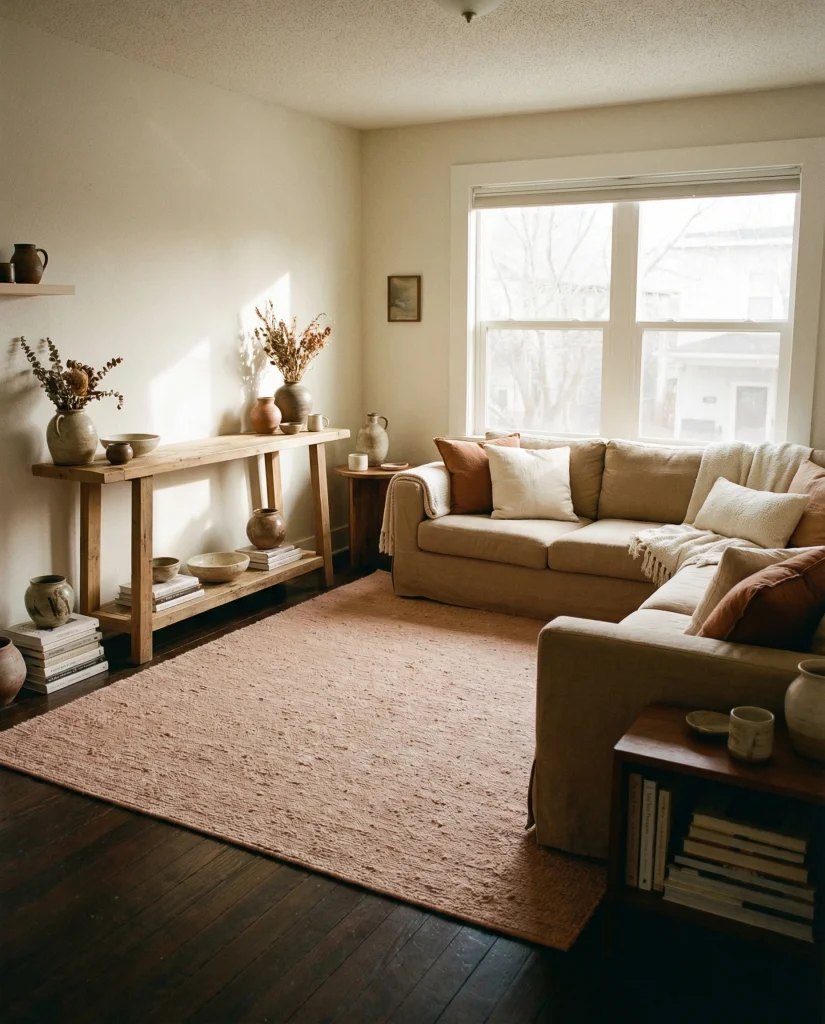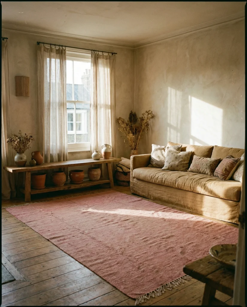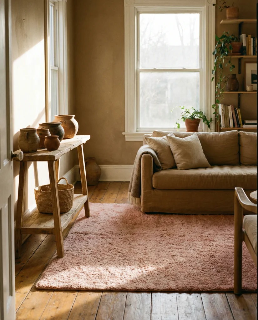 Integrating muted clay-inspired shades like pink can bring a gentle warmth to an earthy living room without feeling overly feminine. Balanced with earth tones, a soft blush rug or clay-colored throw transforms neutrals into something more textured and expressive. It’s an unexpected but natural-feeling pairing.