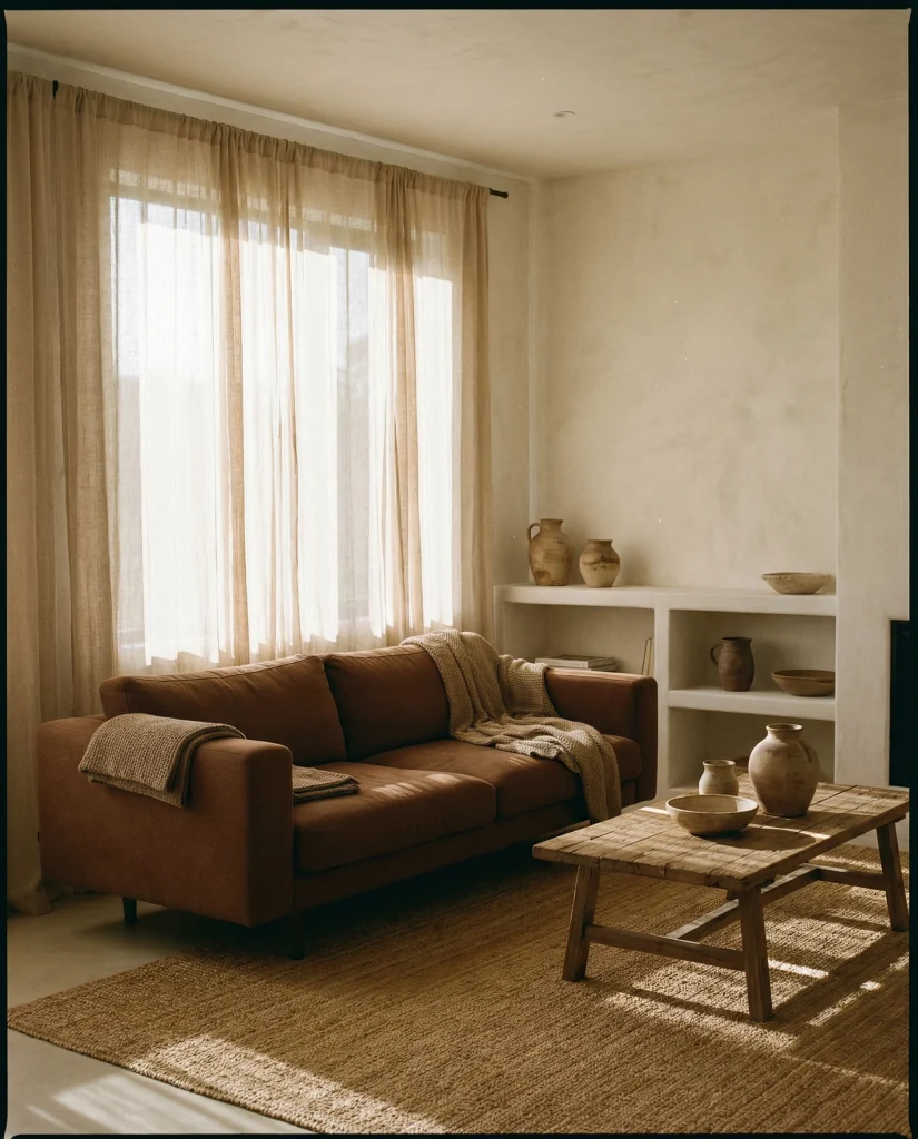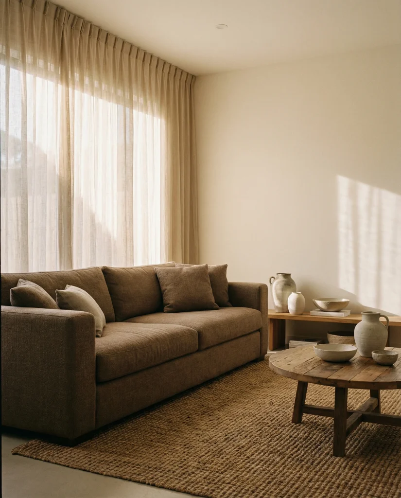 A brown couch combined with cozy minimalist styling brings warmth without excess decor. This idea relies on soft textiles, low-contrast neutrals, and a restrained palette to create a peaceful living room that still feels layered. Clean lines keep the aesthetic modern yet grounded.