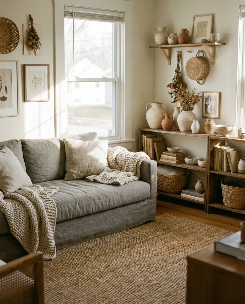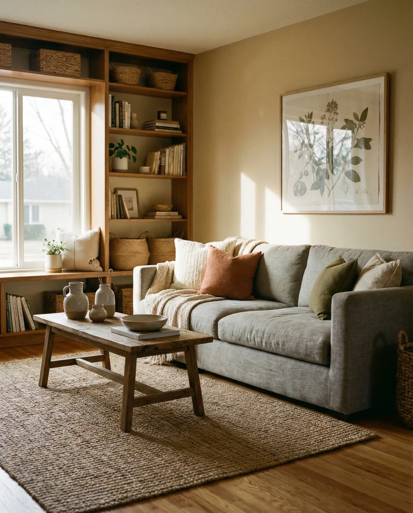 A gray couch becomes a gentle anchor when paired with cozy Earth-toned elements like clay-colored throws and natural wood accents. This mix keeps the room modern while steering it toward warmth. Soft artwork, pottery, and textured textiles complete the look.