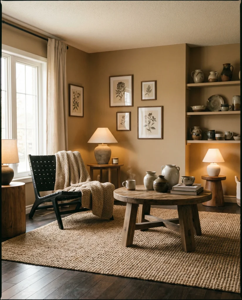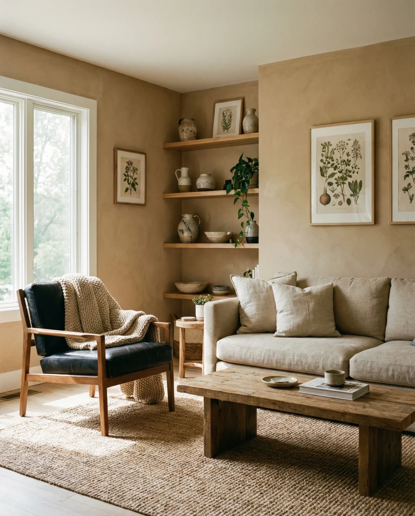 For renters or small homes, an apartment-sized earthy living room can feel just as warm by pairing compact furniture with earth tones in art, textiles, and accessories. This approach focuses on flexible, affordable updates that bring nature’s palette into modest square footage without renovation.