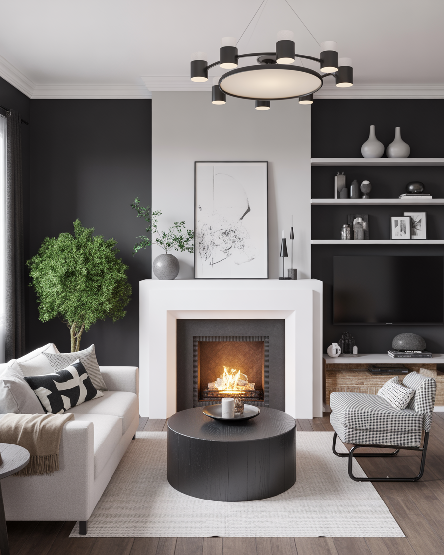Black and white fireplaces remain a dramatic choice in 2026. A white mantel with a black firebox or vice versa gives graphic appeal. Add greenery or art to the side of the hearth for contrast and elegance.