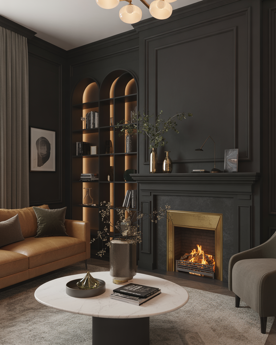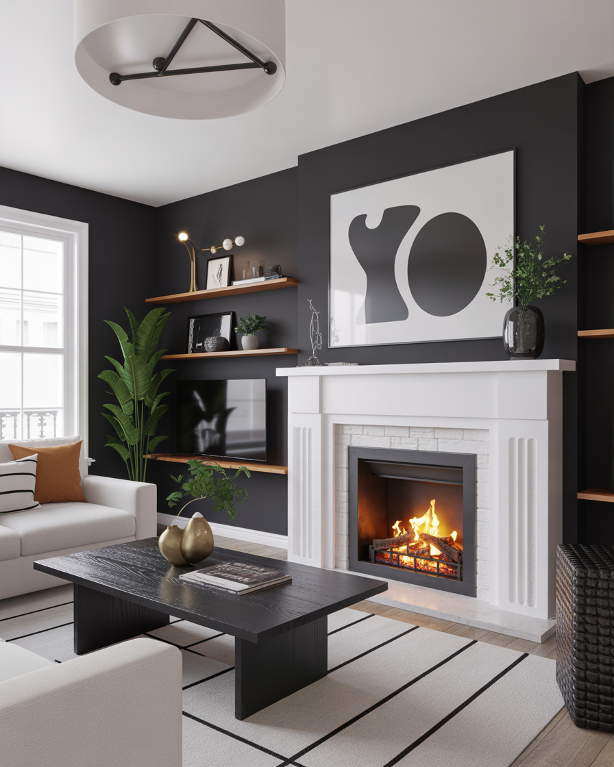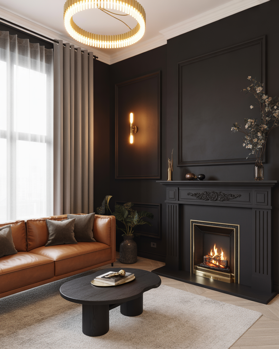 Embrace drama with a black fireplace wall. Whether it’s painted brick or matte tile, it instantly grounds your space. Complement with brass accents and velvet textures for that luxurious, moody vibe trending in 2026.