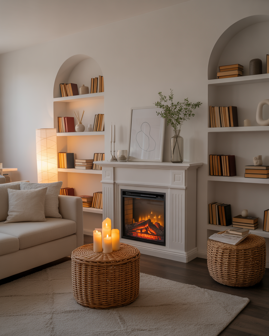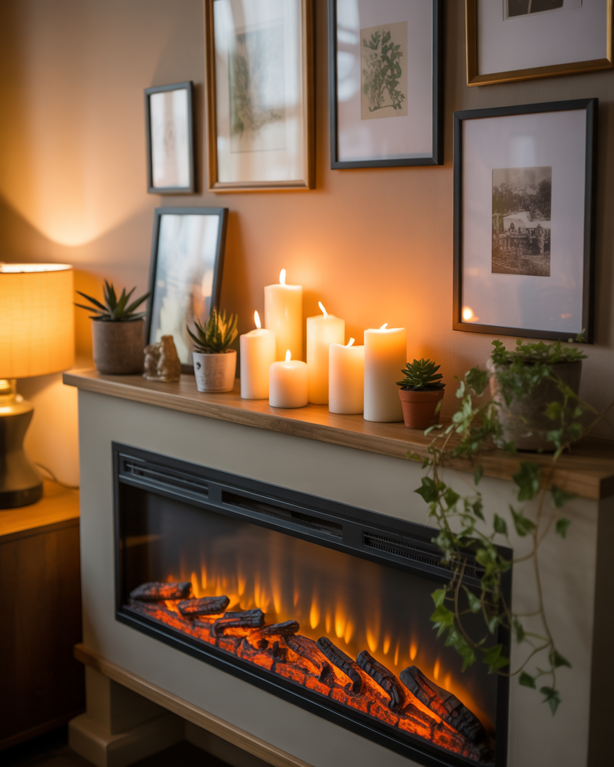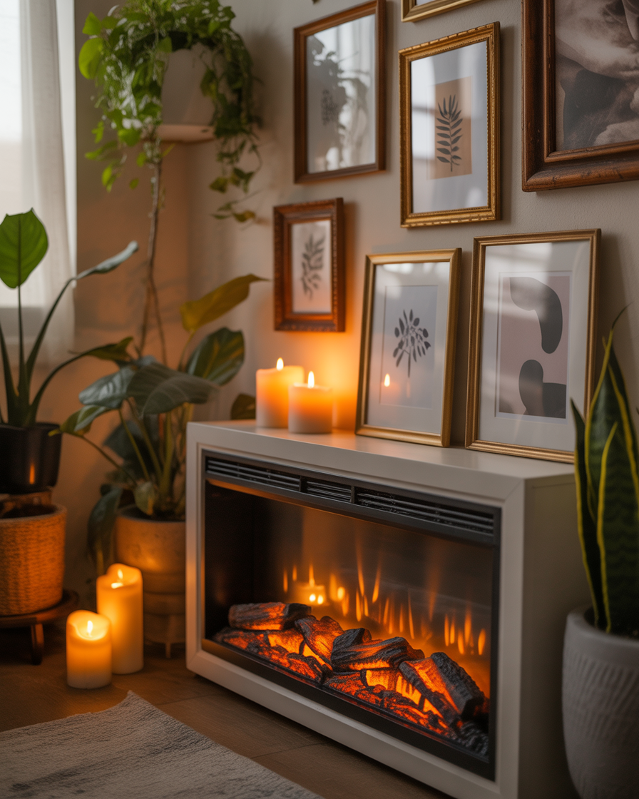 If your home has limited space, use an unused corner to install a small electric or faux fireplace. Style it with framed prints, candles, or potted plants to make it feel intentional and warm.
