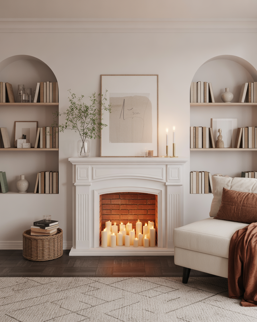 Don’t have a working fireplace? A faux or fake mantel can still create a stunning focal point. Paint it white for a minimalist vibe or black for drama, then fill the opening with candles, logs, or even stacked books for visual warmth in an unused hearth.