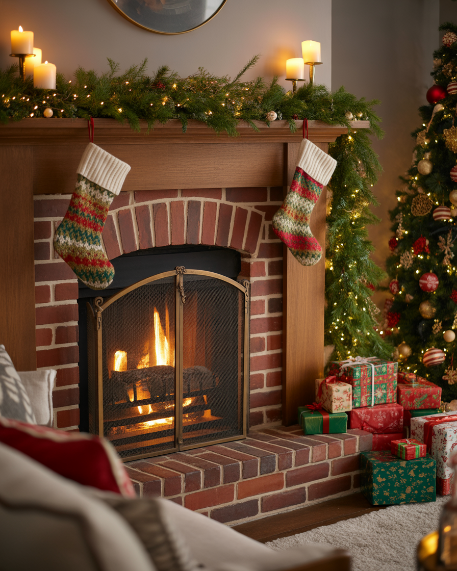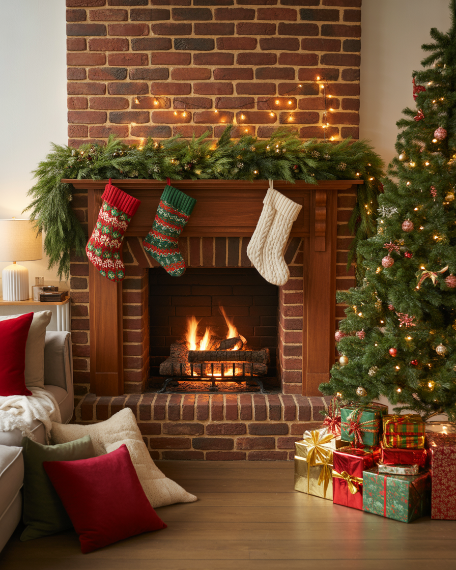 During the holidays, make your fireplace the centerpiece of your home. Garland, stockings, fairy lights, and even a playful Grinch figurine bring festive spirit over the mantel. Mix red brick textures with twinkling lights for timeless Christmas charm.