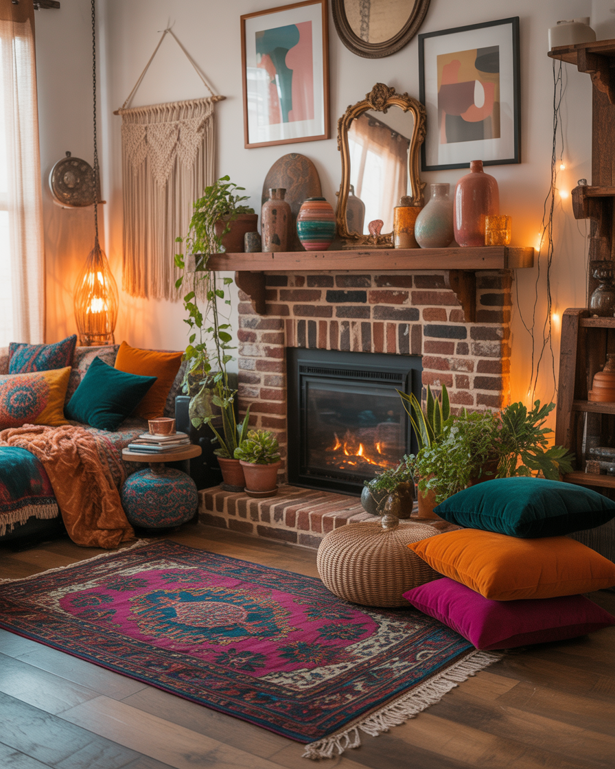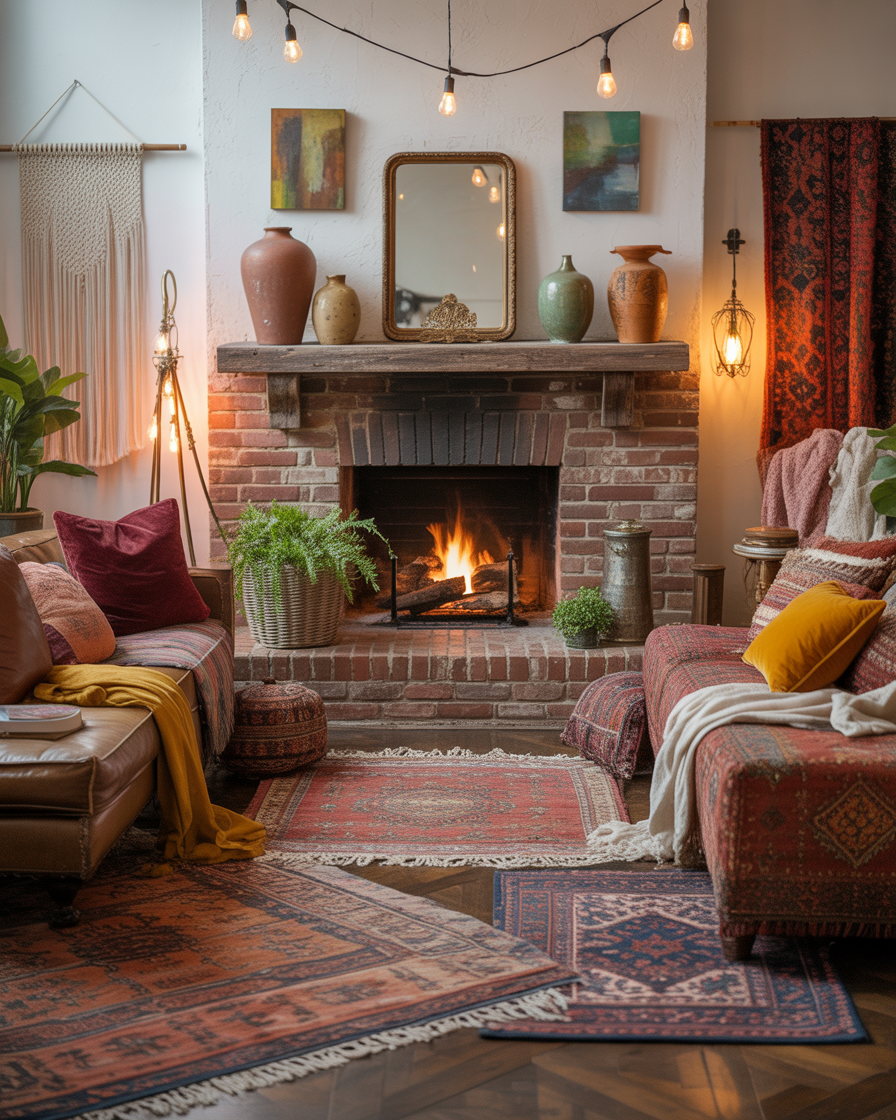 For those who adore a mix of styles, try an eclectic fireplace decor approach. Combine framed art, sculptural vases, and textured mirrors for a collected look. Layer items over and in front of the mantel to create dimension, especially in colorful or bohemian interiors.