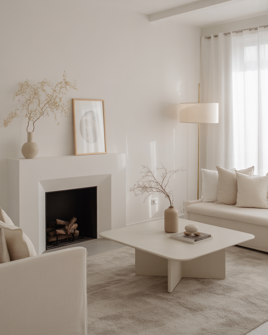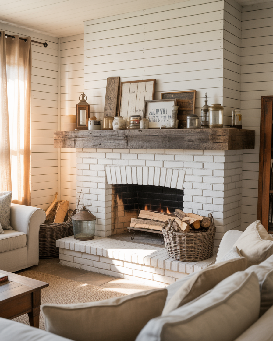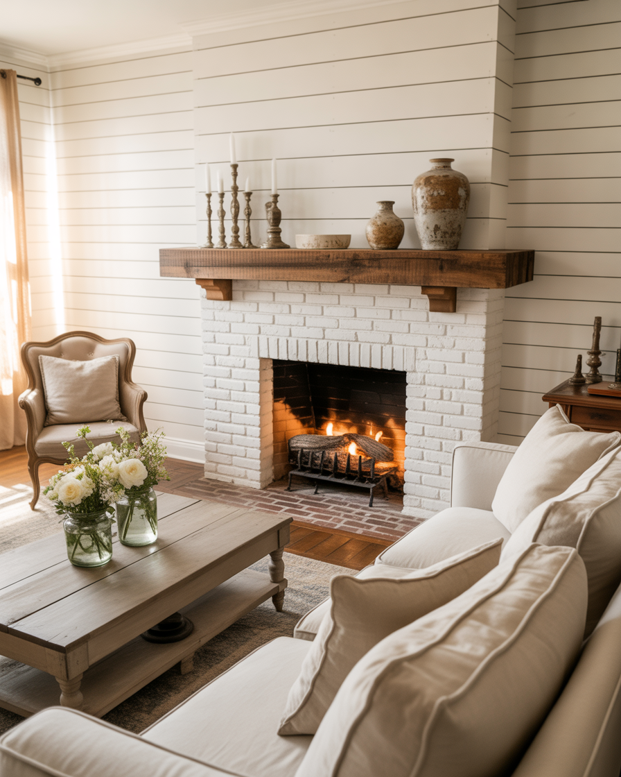 Farmhouse style continues to rule 2026. Try pairing your white fireplace with shiplap walls, vintage clocks, and soft linen curtains. A rustic wood mantel completes the cozy countryside aesthetic.