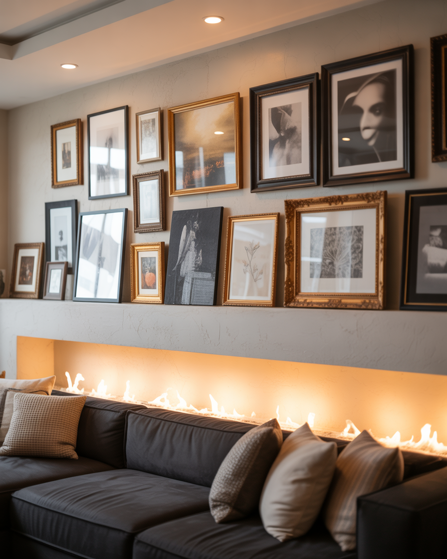Instead of hanging a single piece over your mantel, layer multiple artworks of different sizes for depth. This eclectic approach adds visual interest and makes the fireplace wall a true gallery feature.