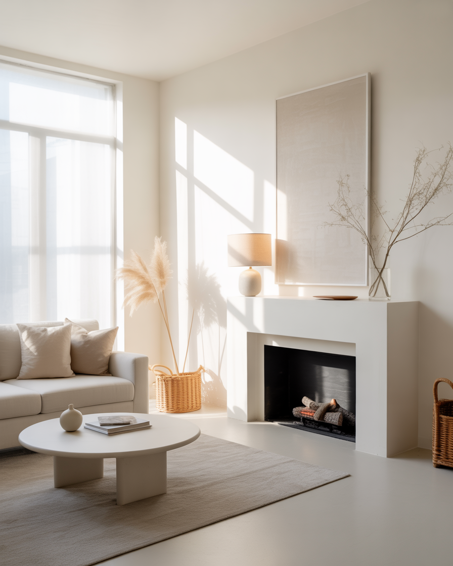 A white fireplace surrounded by wrapped neutrals and crisp lines creates a calming, modern appearance. Keep decor minimal: a sculptural vase or a few branches on top of the mantel will do the trick. This style shines in living rooms where natural light is abundant.