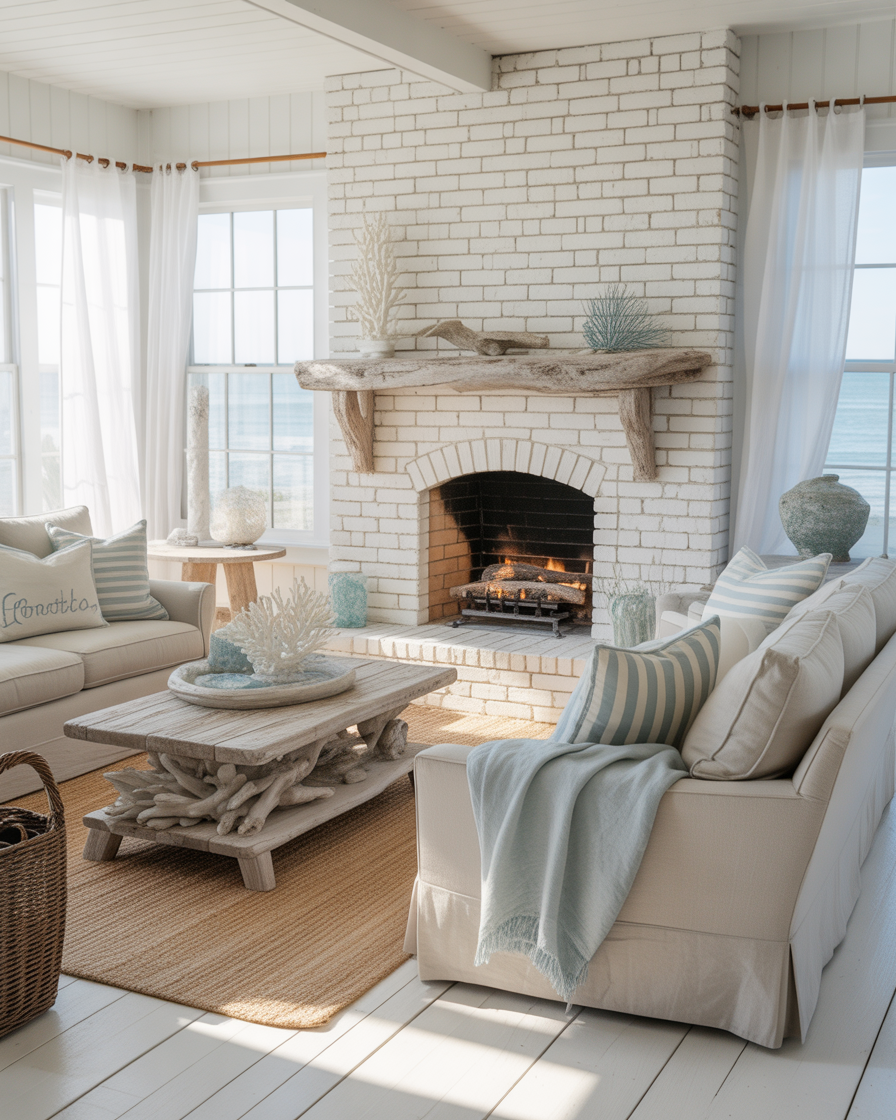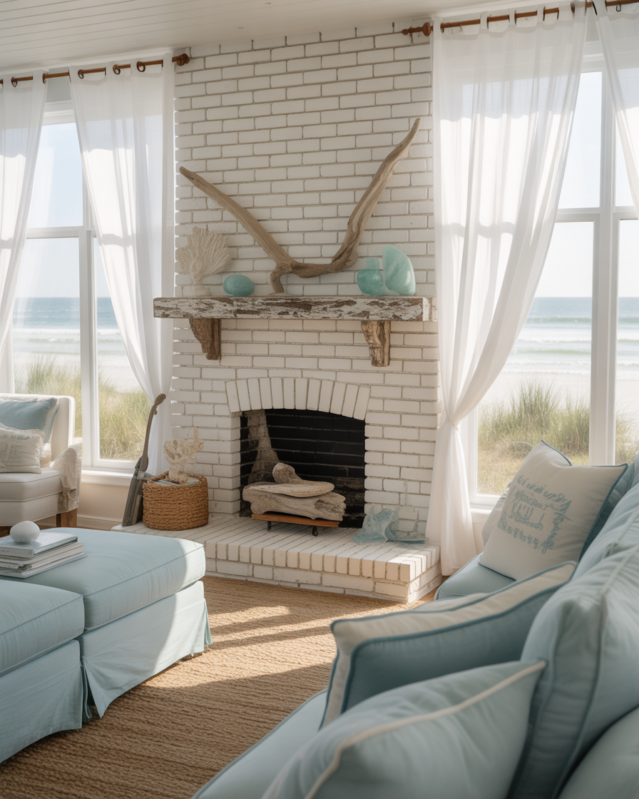 A coastal fireplace design feels breezy and relaxed. Paint brick white, add driftwood accents, and use soft blues and sandy tones. Perfect for beach-inspired living rooms or bedrooms.