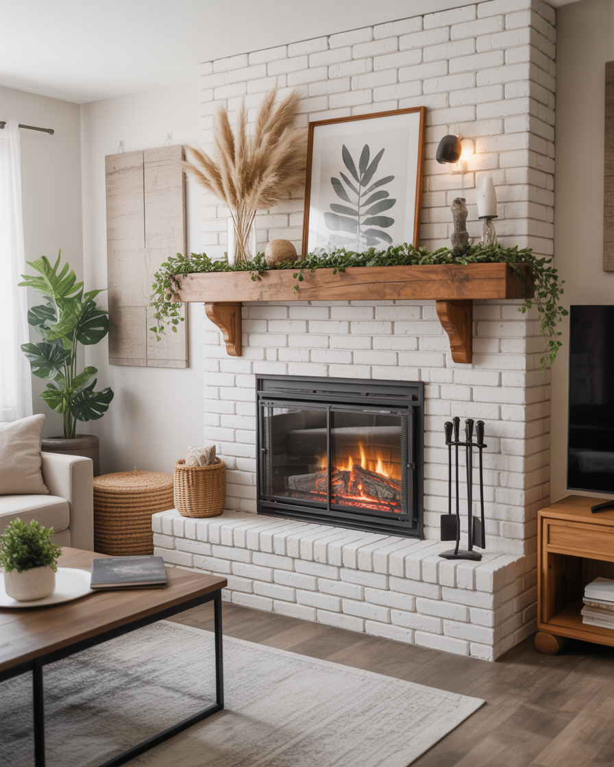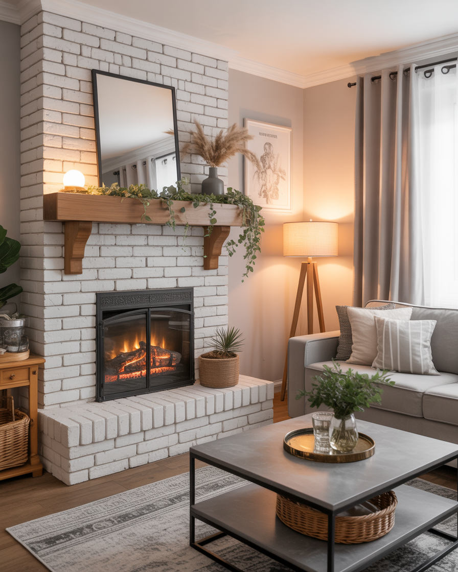 Classic brick fireplaces are getting a modern makeover in 2026. Think creamy whitewashed finishes paired with black iron accents, chunky wood mantels, and natural greenery for warmth. This rustic yet refined balance works beautifully in both living rooms and farmhouse-style homes.