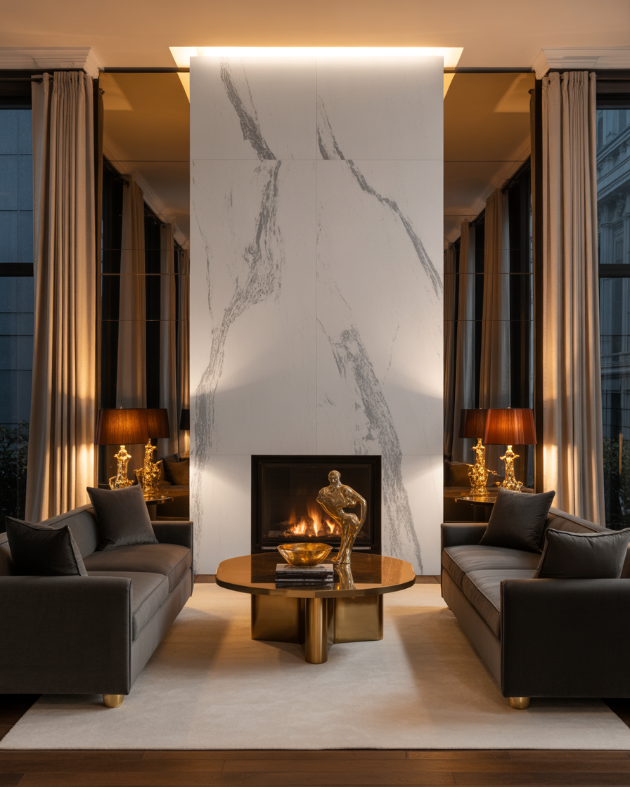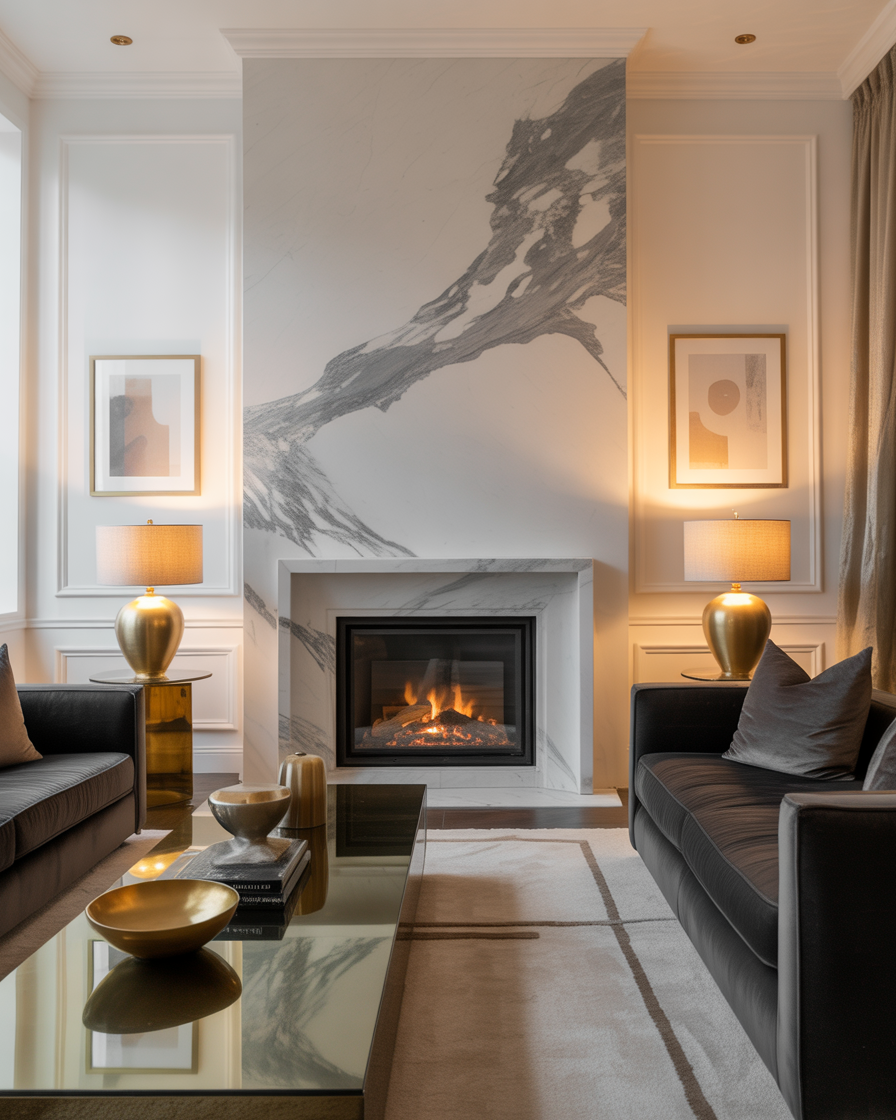 or a touch of high-end elegance, surround your fireplace with veined marble. Whether it’s black marble with gold streaks or white Calacatta, this look screams sophistication and works beautifully inside sleek living rooms.