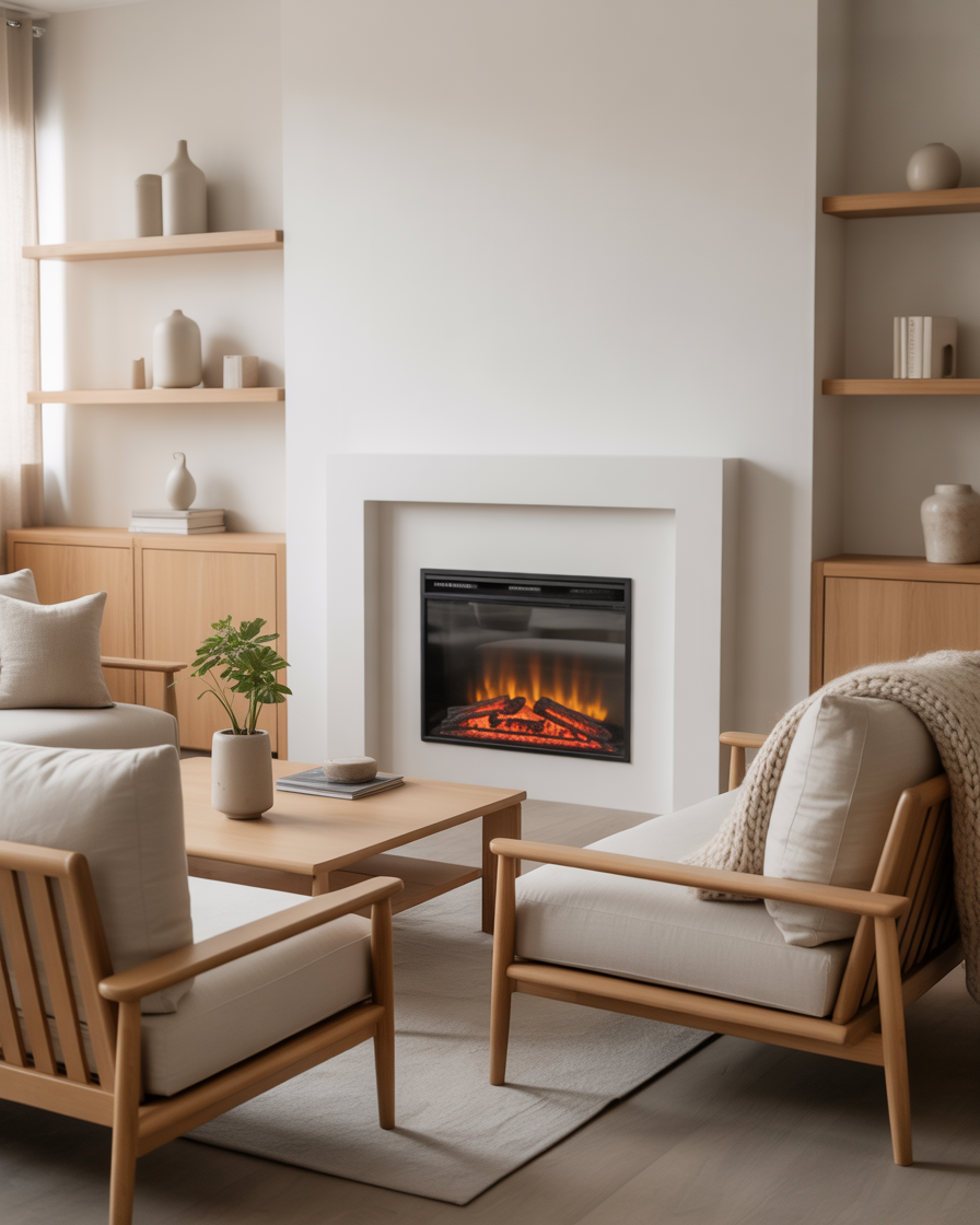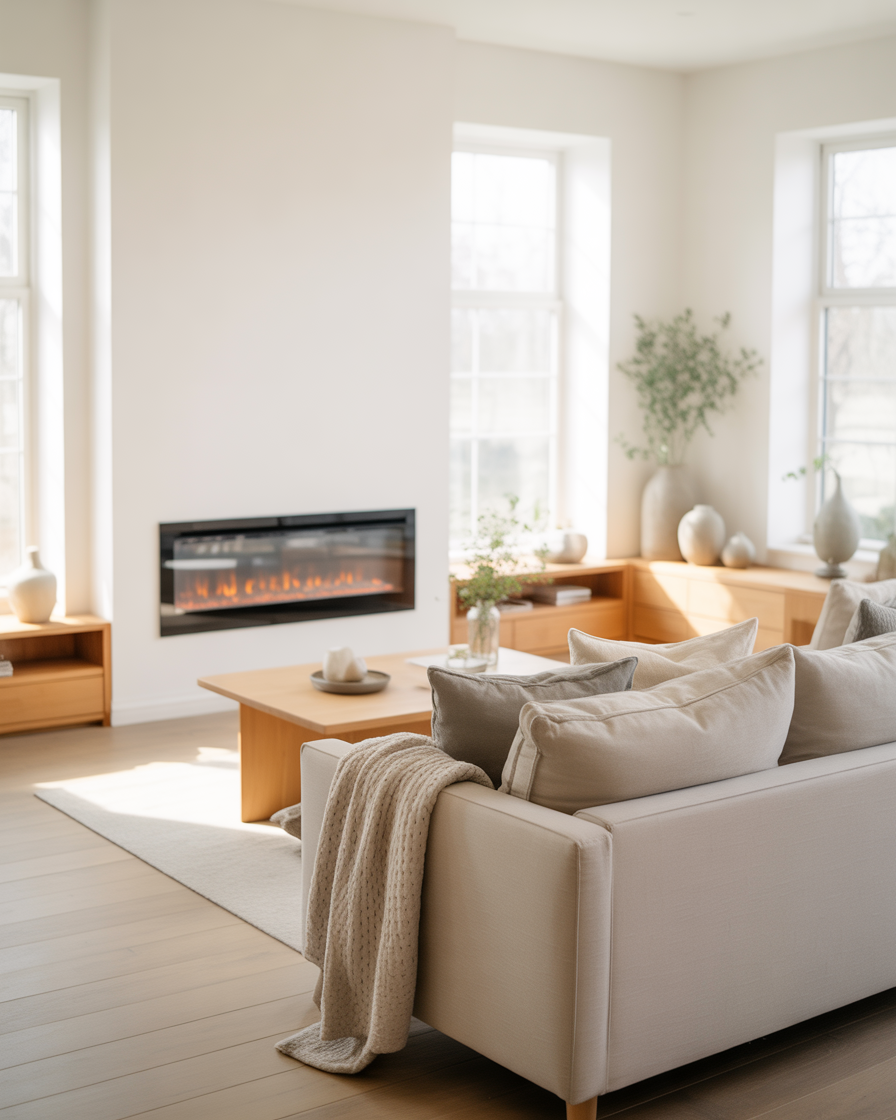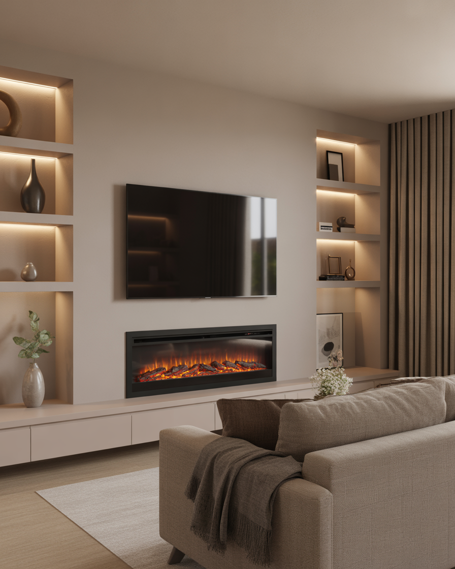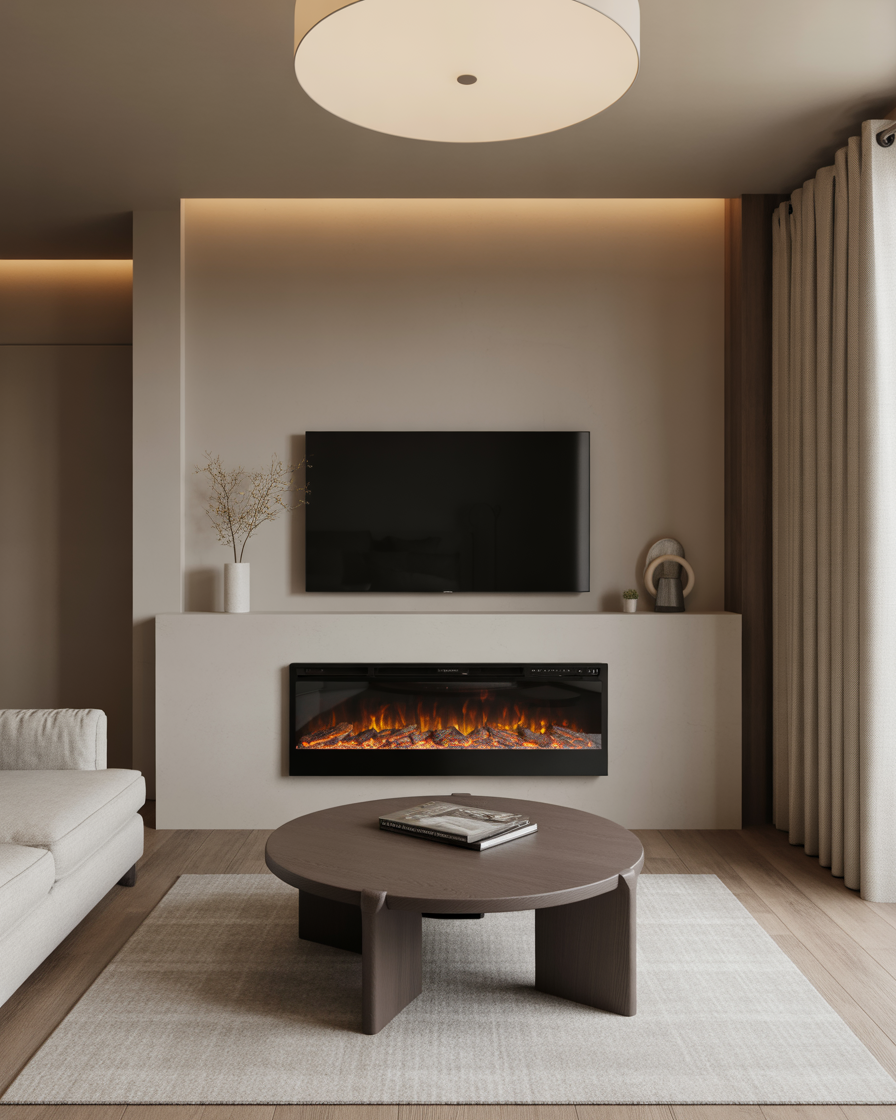 If you love minimalism, a modern electric fireplace is your best friend. These low-profile units can be installed inside media walls or under a TV, creating a seamless, clean aesthetic. Decorate the top of the mantel with candles, books, and ceramics for understated sophistication.