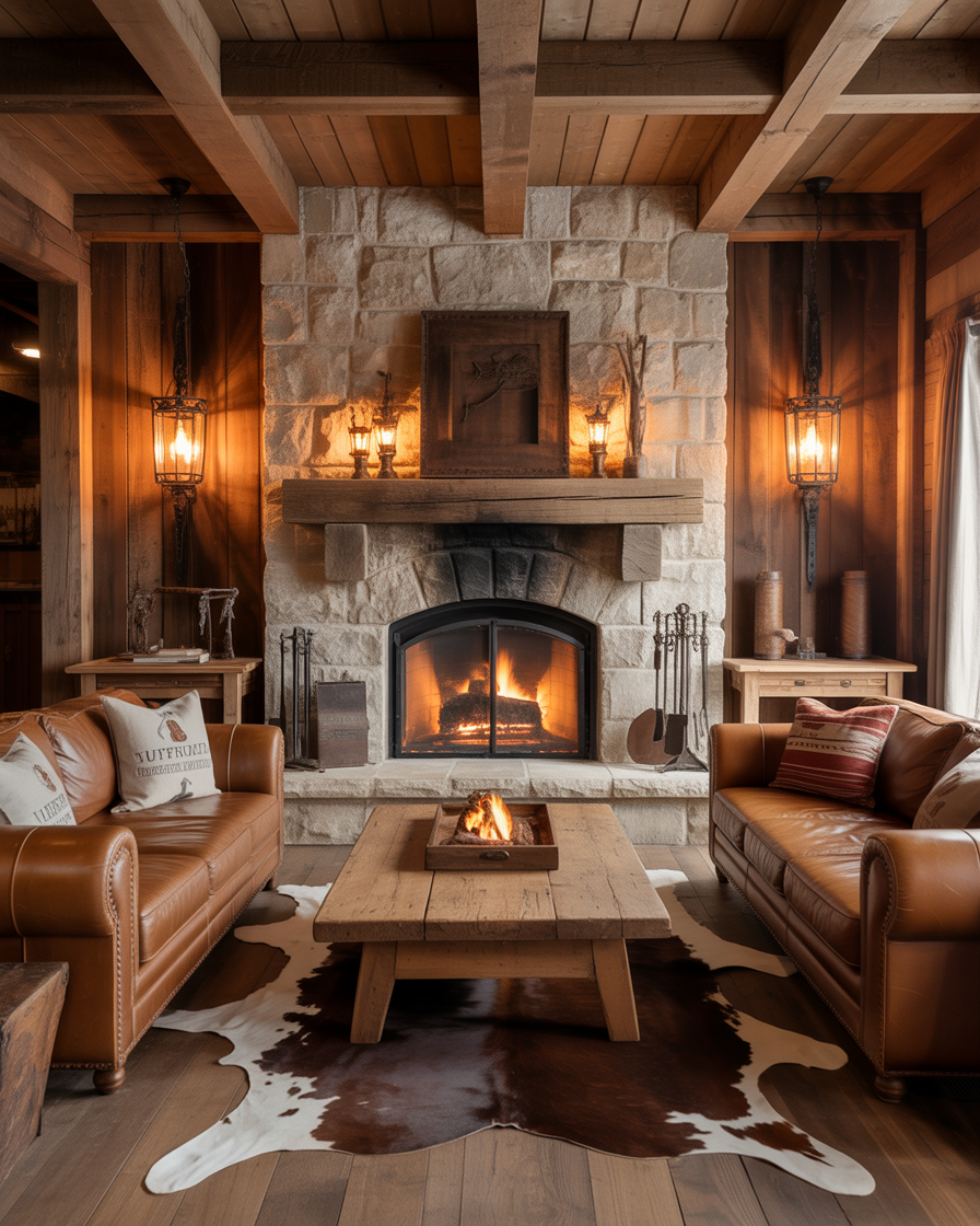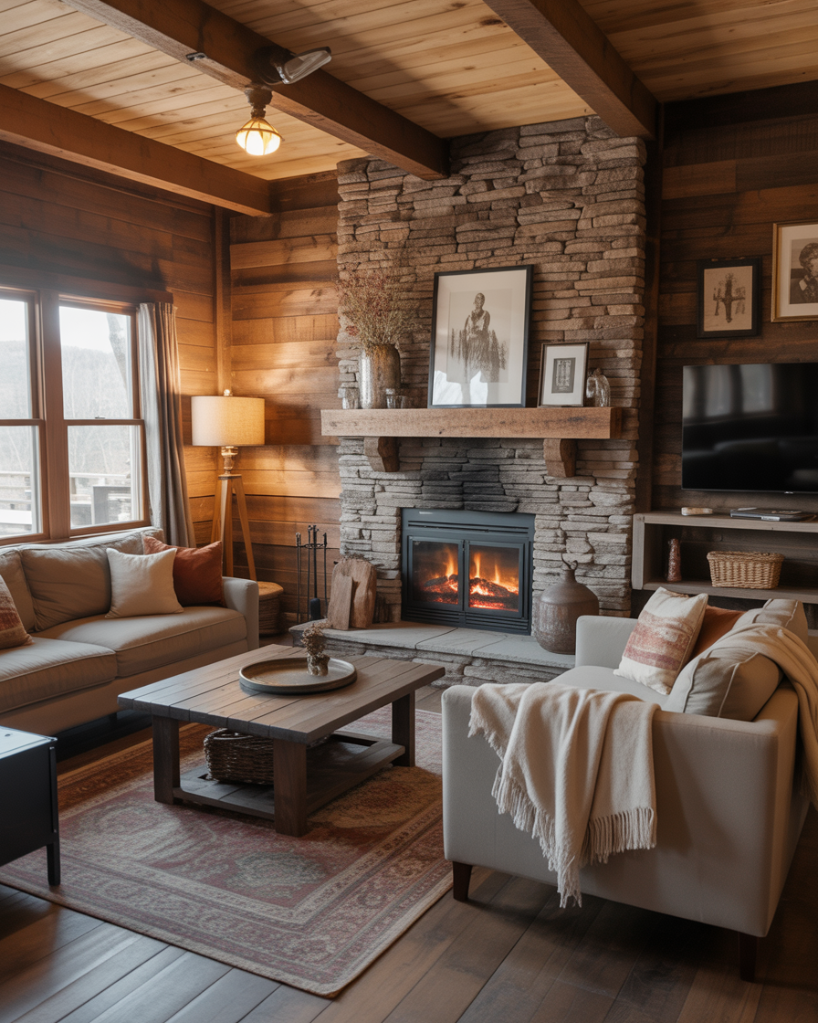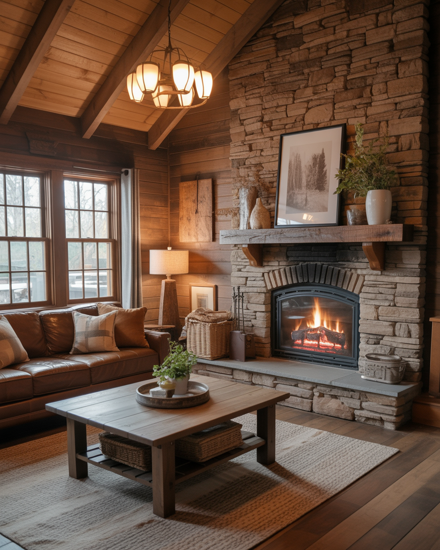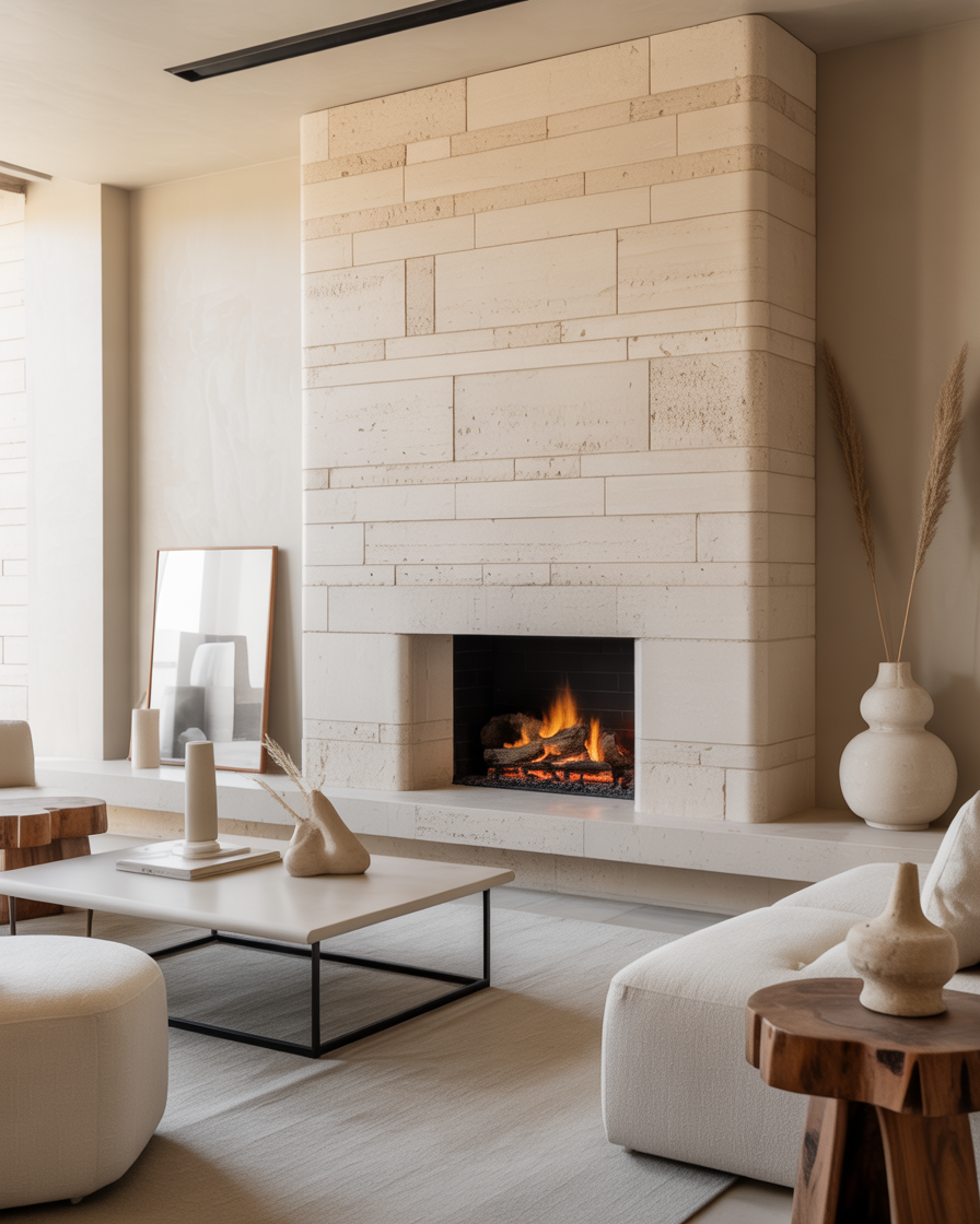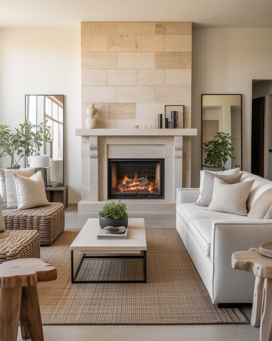 Adding a stone fireplace introduces natural texture that is never trendy. Pair light gray or limestone finishes with neutral fabrics and black metal details for balance. Perfect for living rooms where sophistication meets coziness.