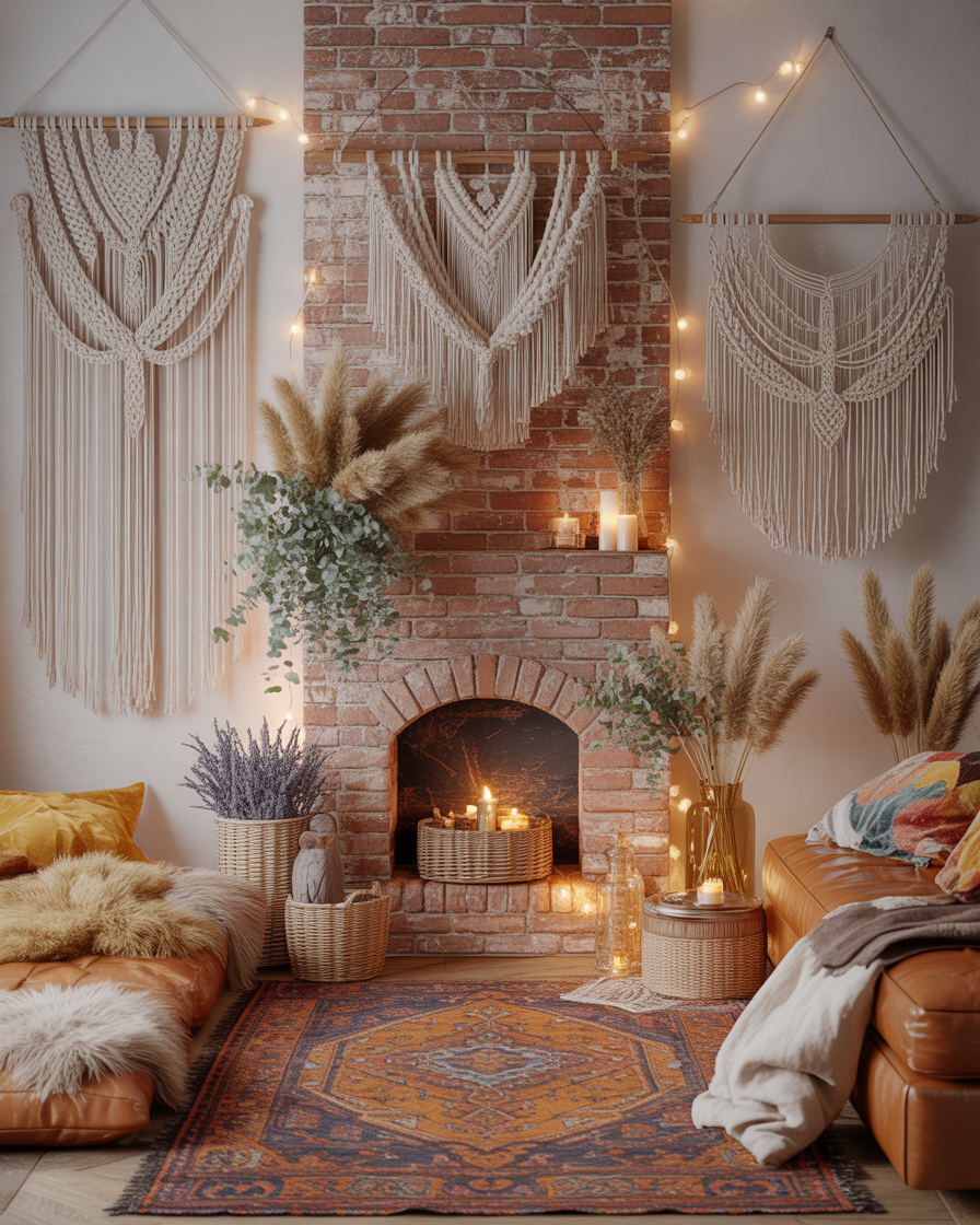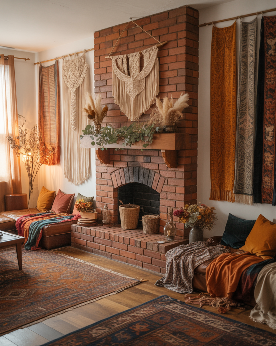 Bring character back to your red brick fireplace with bohemian charm. Layer macramé, dried florals, and woven baskets around the hearth. The blend of earthy colors and texture creates effortless style.