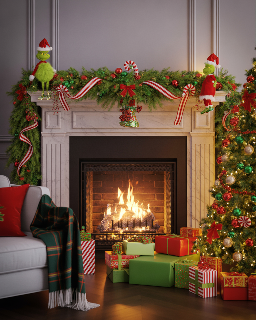 Make it funky and fun this Christmas with Grinch-inspired cheer on your mantel featuring whimsical green garlands, candy-cane stripes, and unconventional stockings. It’s perfect for families that like a splash of humor in their living rooms.