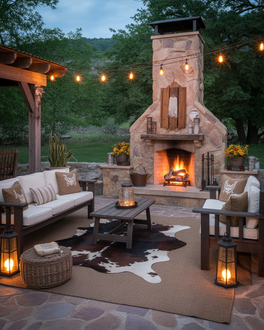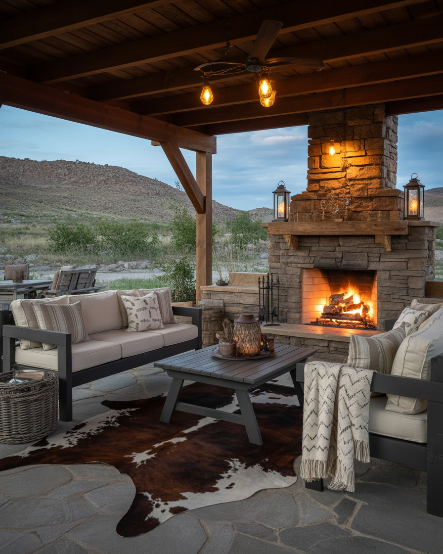 For those who love entertaining outside, 2026 trends embrace outdoor and western fireplace decor. Think rugged stone, cowhide rugs, iron lanterns, and woven throws around a fire pit or outdoor hearth—perfect for chilly nights and starlit gatherings.