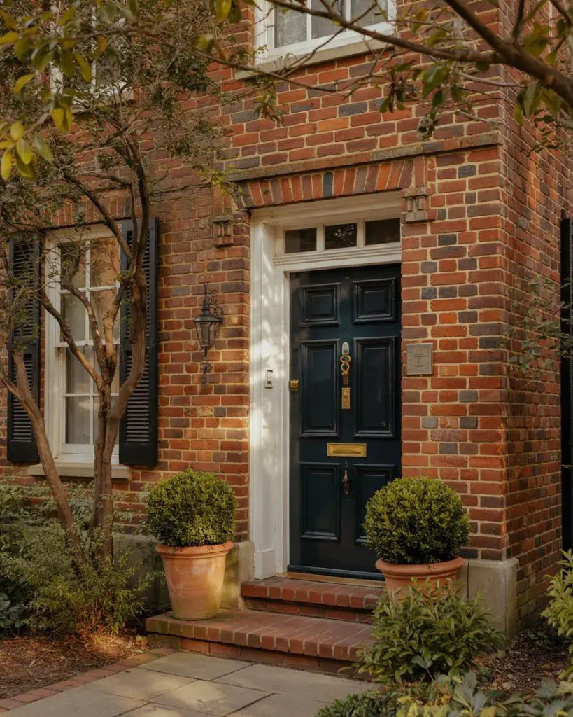 If your home features traditional red brick, a deep navy front door creates a timeless, sophisticated contrast that feels both bold and grounded. This pairing works beautifully on colonial and Tudor-style homes, where the warmth of the brick is balanced by the cool depth of navy. The color combination has been a favorite among design-conscious homeowners for decades, but it feels especially fresh in 2026 with modern hardware and minimal landscaping. Navy also photographs exceptionally well, making it a Pinterest favorite for curb appeal transformations.