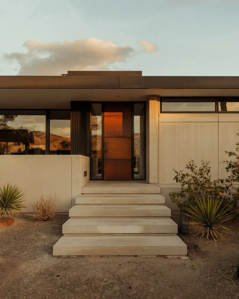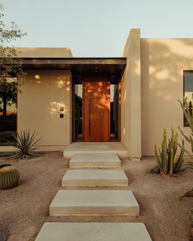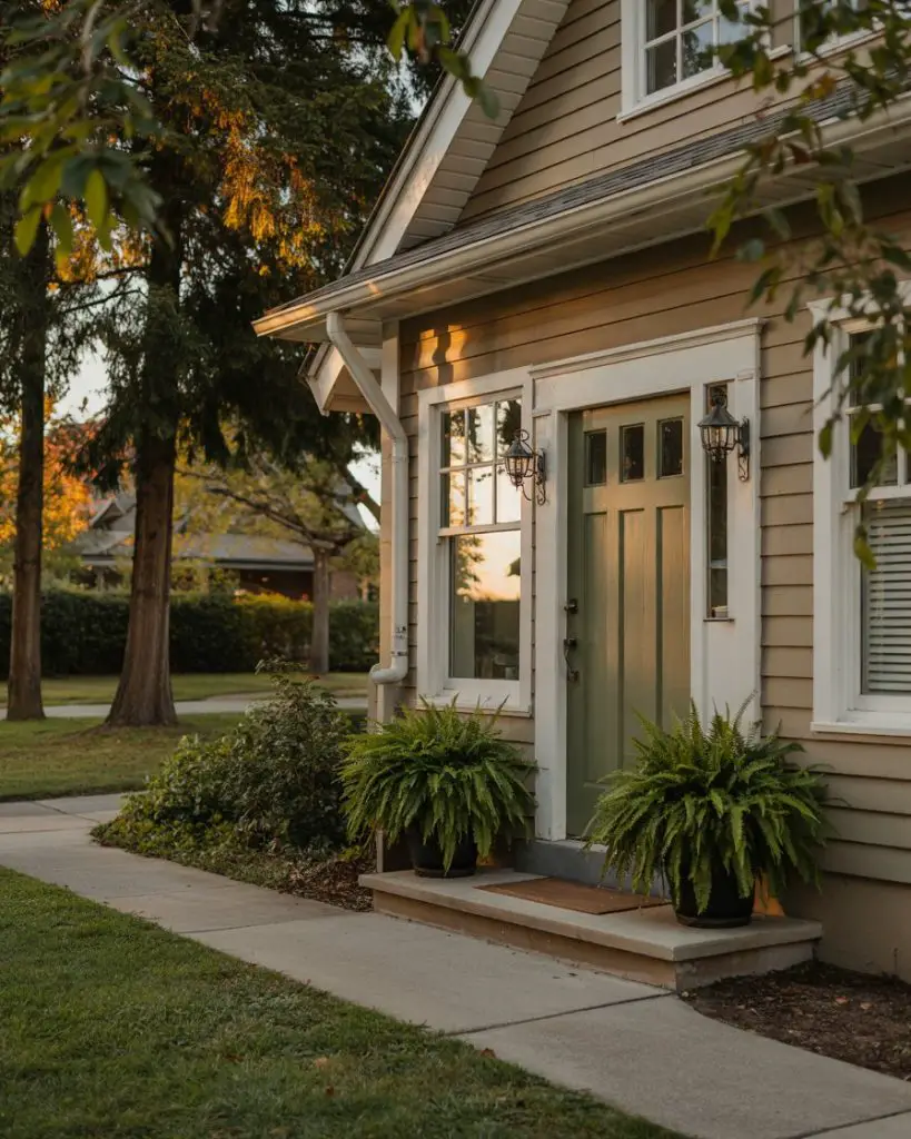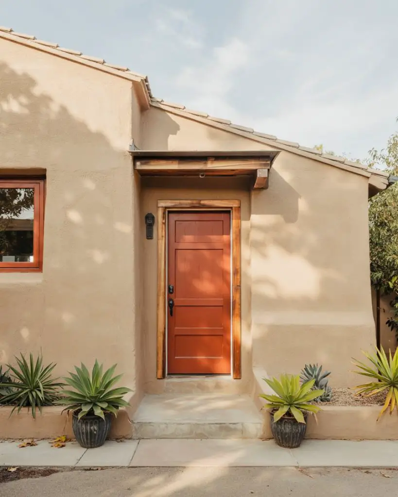 A tan house exterior benefits beautifully from a terracotta or burnt orange front door, which adds warmth without overwhelming the neutral palette. This color choice nods to Southwestern and Mediterranean design traditions while feeling completely contemporary in 2026. It’s especially effective on stucco or wood siding homes, where the earthy tones create a cohesive, sun-baked aesthetic. Terracotta pairs wonderfully with natural wood accents, woven door mats, and desert-inspired landscaping.