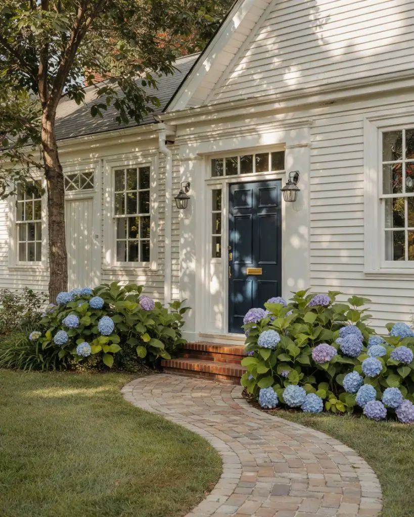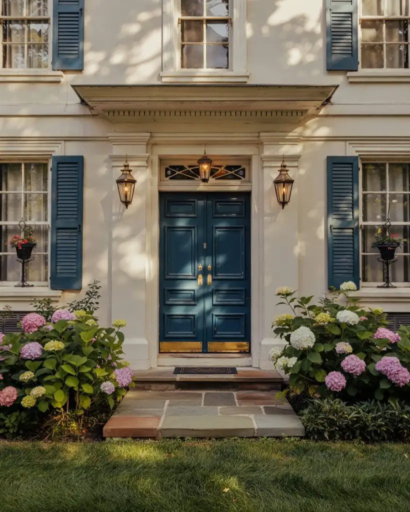One practical insight worth noting: navy holds up well in full sun without fading as quickly as lighter blues, which means less frequent repainting and lower maintenance over time. It also hides dirt and wear better than whites or pastels, making it ideal for busy households with kids or pets. Pair it with brushed brass or matte black hardware for a polished, intentional look that elevates the entire facade.