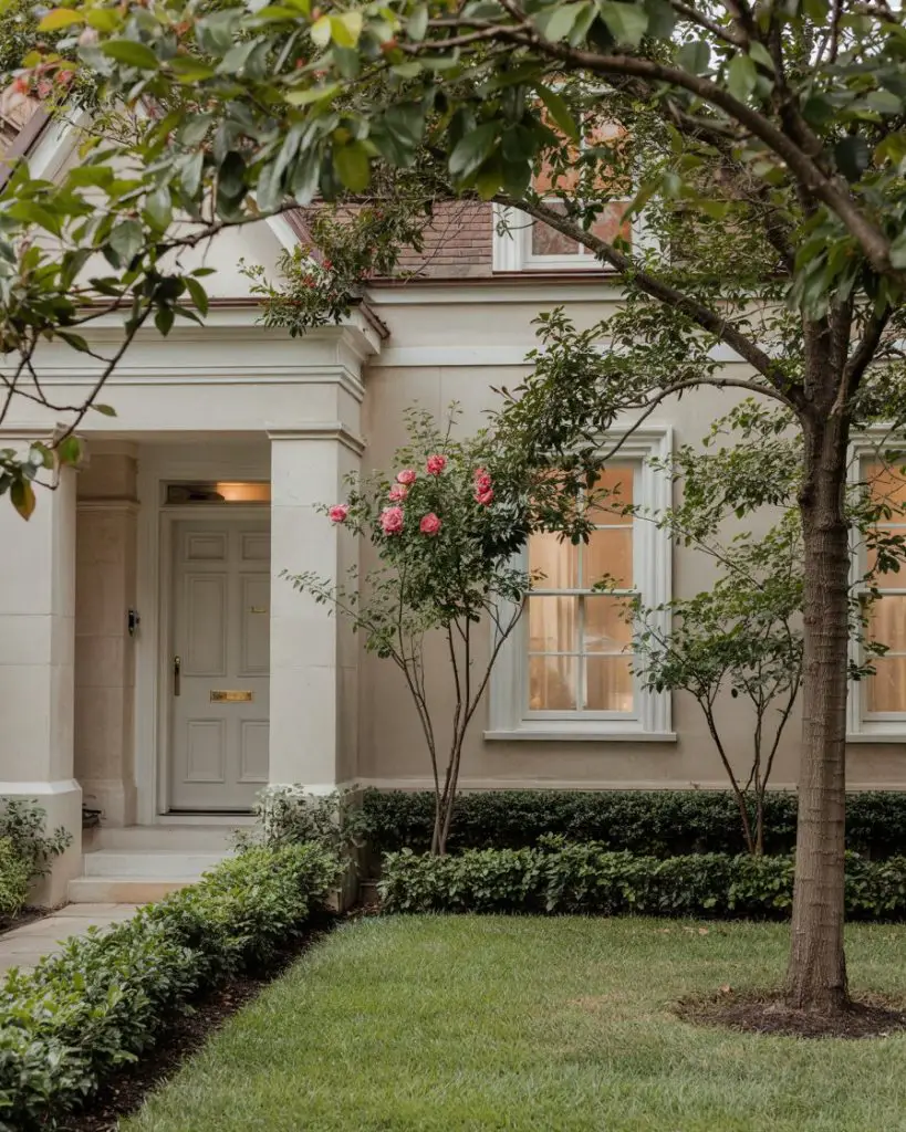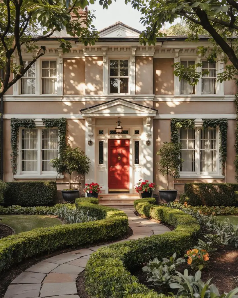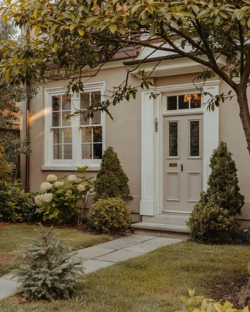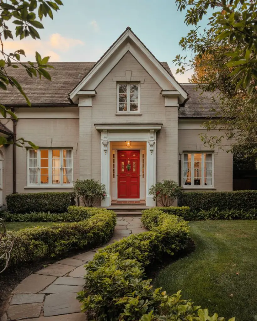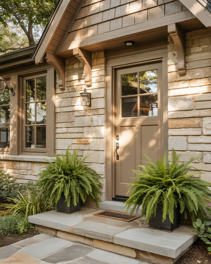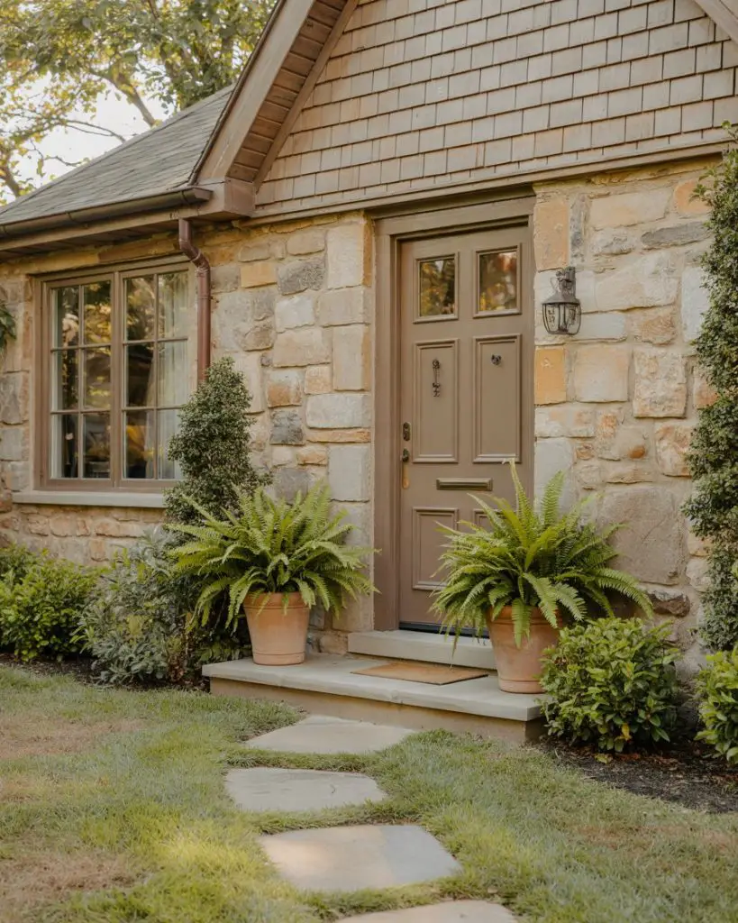 For homeowners drawn to neutral and earthy tones, a warm taupe front door offers subtle sophistication without disappearing into the background. Taupe works beautifully on brick, stone, and natural wood exteriors, providing just enough contrast to define the entry without making a loud statement. It’s an understated choice that appeals to those who prioritize timelessness over trends, and it pairs effortlessly with natural landscaping, stone pathways, and organic textures. Taupe also photographs well in all seasons, from spring blooms to autumn foliage.