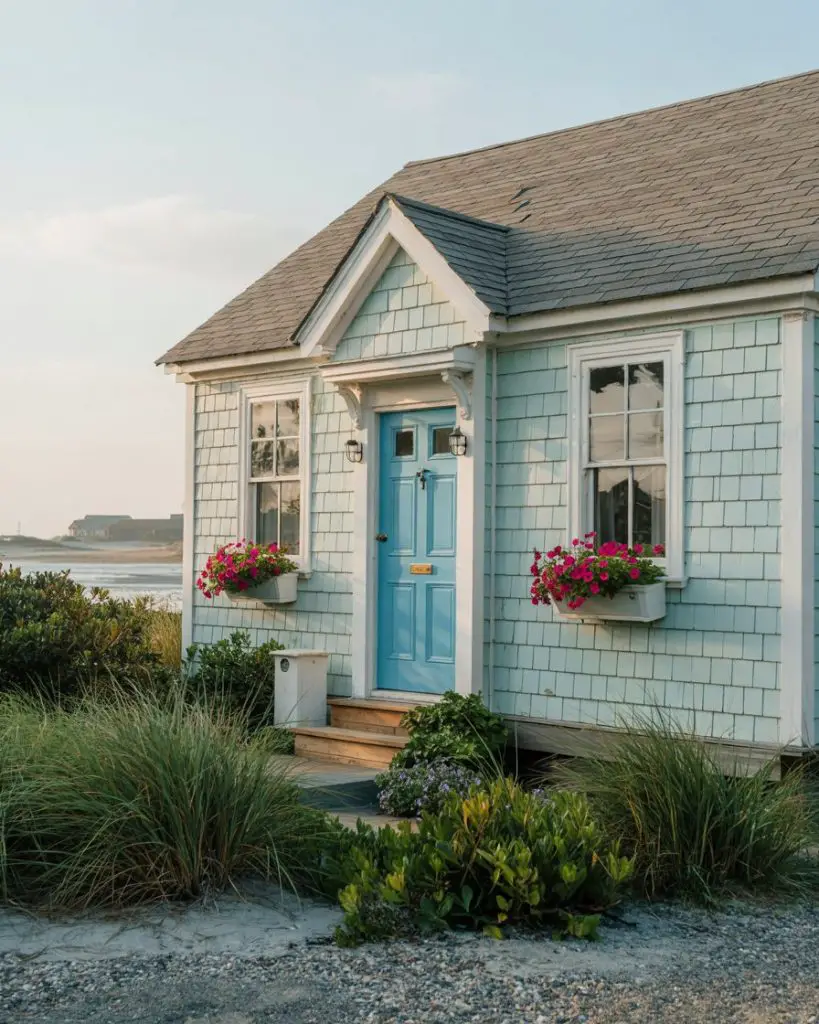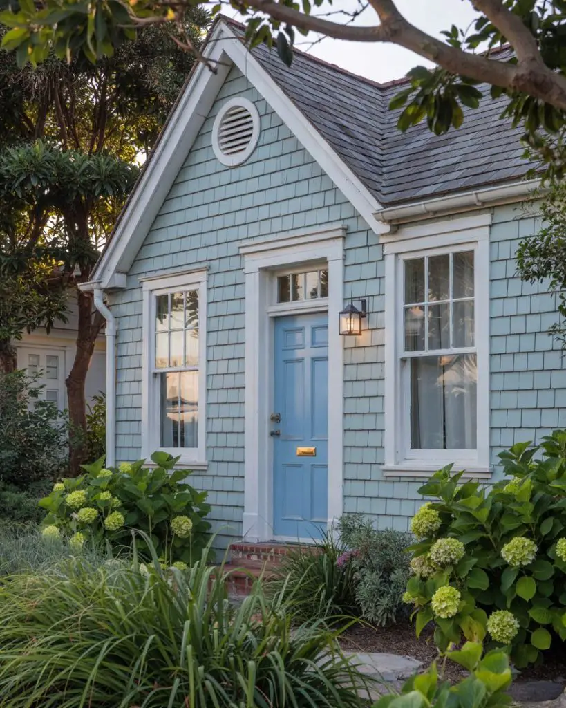 If you have a light blue house, a front door in a deeper or contrasting shade of blue creates a monochromatic, cohesive look that feels serene and intentional. Sky blue, powder blue, or even a soft periwinkle can work beautifully, depending on your siding tone. This approach creates visual interest through variation in saturation rather than competing colors, resulting in a calming, harmonious exterior. It’s particularly effective on coastal and cottage-style homes where blue is already part of the architectural vernacular.