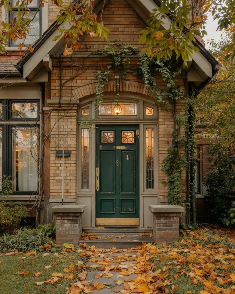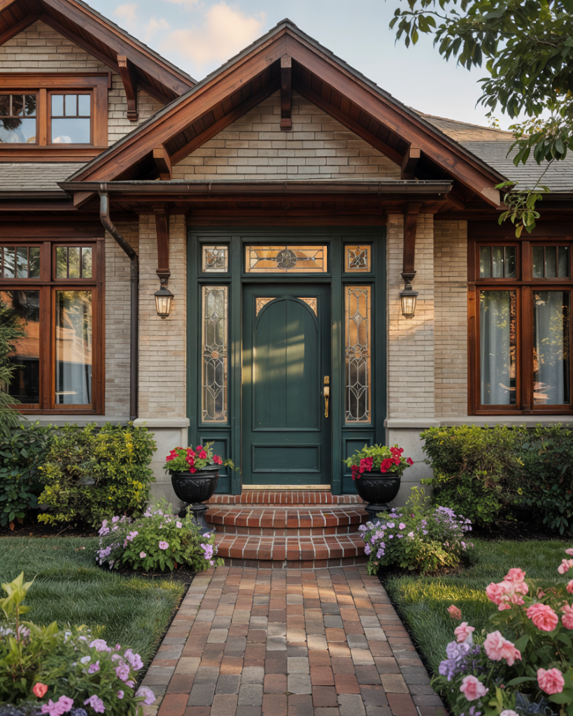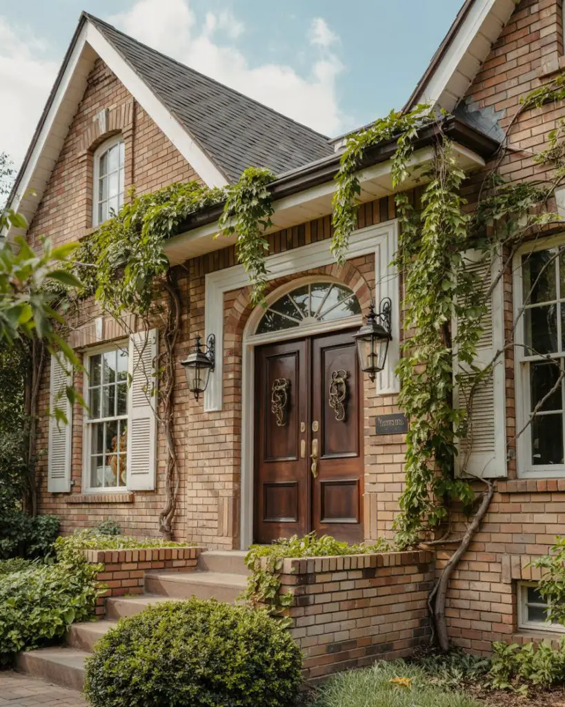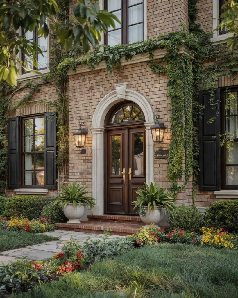 When searching for ideas for brown brick house exteriors, a front door in a complementary warm brown or chocolate tone creates a rich, layered look that feels both grounded and sophisticated. This monochromatic approach allows texture and architectural detail to shine without competing colors. Alternatively, a cream, sage, or even muted teal can provide contrast while still harmonizing with the brown brick. The key is choosing a door color that enhances rather than fights the inherent warmth of brown brick.