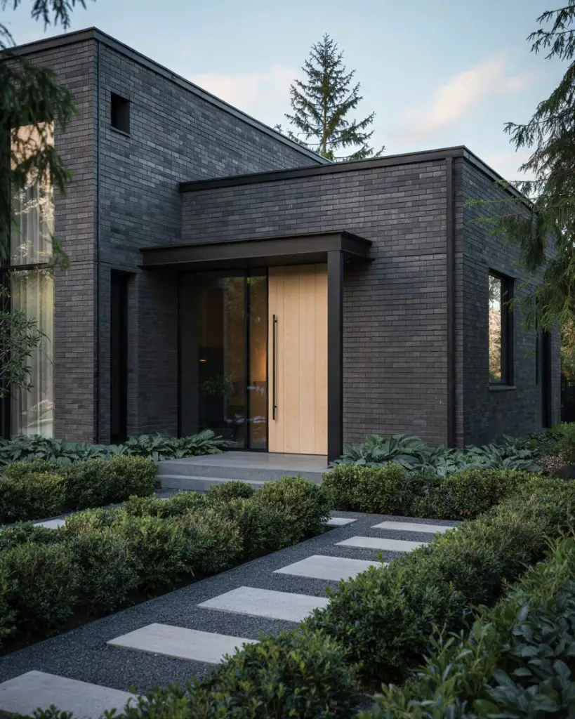 A dark gray house benefits from a front door that either blends or contrasts intentionally. A charcoal door creates a sleek, monochromatic look that feels ultra-modern, while a warm cream or off-white door provides striking contrast and visual relief. Both approaches work, but the choice depends on whether you want your entry to recede or pop. Dark gray exteriors are trending in 2026 for their contemporary sophistication, and the door color becomes a critical decision point in the overall aesthetic.