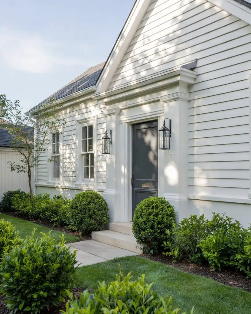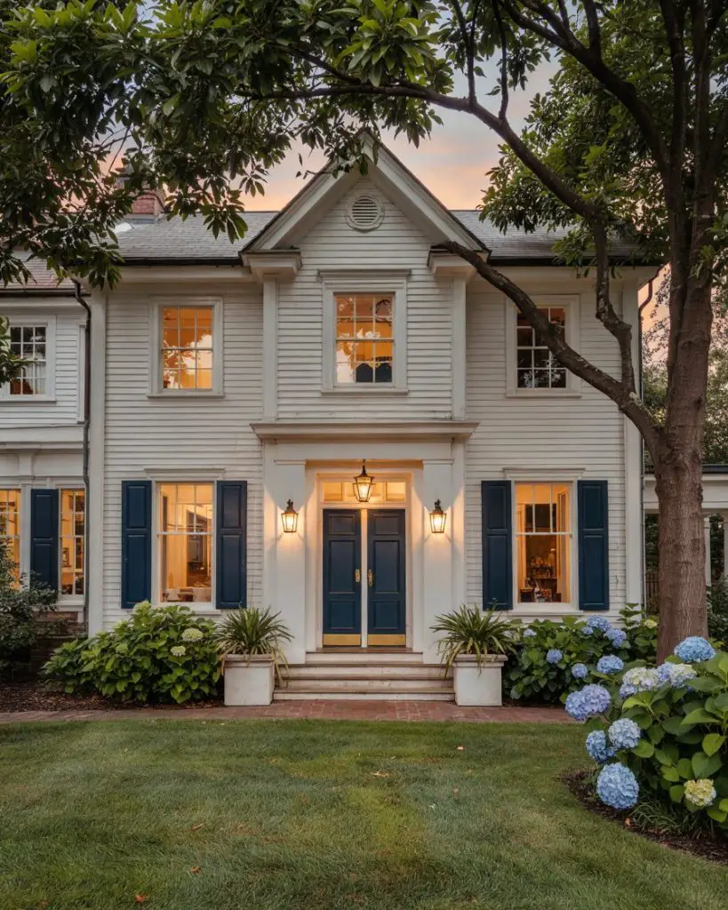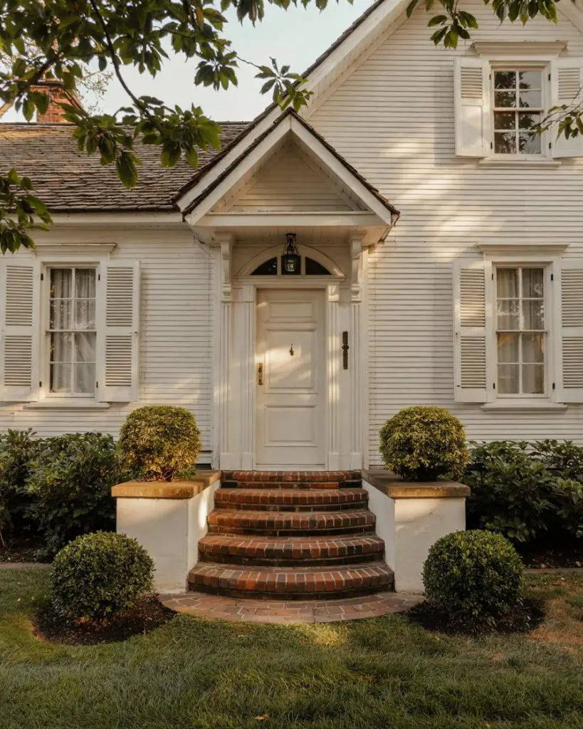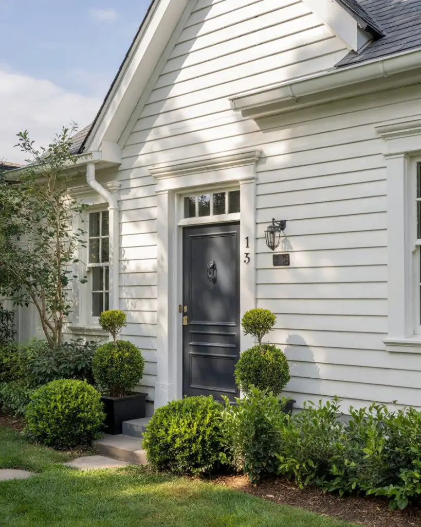 The combination of a white front door with black shutters creates a timeless, high-contrast look that never goes out of style. This pairing is particularly effective on colonial, farmhouse, and Cape Cod-style homes, where symmetry and clean lines are architectural hallmarks. The white door brightens the facade and creates a welcoming focal point, while the black shutters provide structure and definition. It’s a classic American aesthetic that feels both traditional and fresh, depending on hardware and landscaping choices.