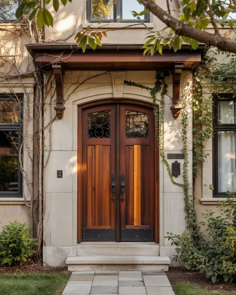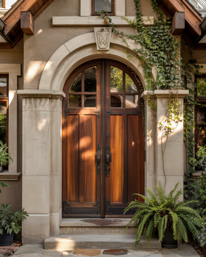 For those who prefer the look of natural materials, a brown mahogany or walnut-stained wood front door brings organic warmth and texture to any home. This choice works beautifully on craftsman, ranch, and mountain-style homes, where wood is already a prominent material. A natural wood door ages gracefully, developing character and patina over time, and it pairs effortlessly with stone, brick, or siding in neutral tones. It’s a choice that feels authentic and grounded, appealing to homeowners who value natural materials and traditional craftsmanship.