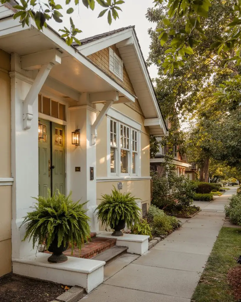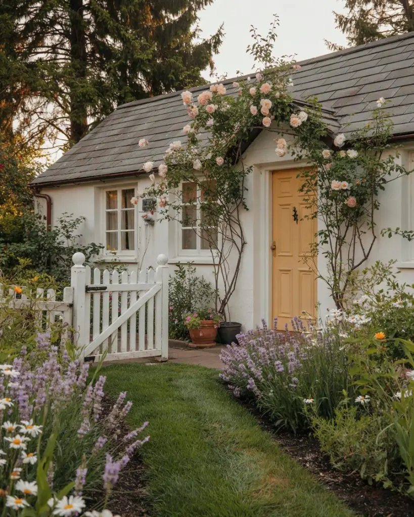 A cheerful yellow front door instantly transforms a cottage-style home into a welcoming, storybook retreat. This color choice is especially effective on smaller homes with white or cream exteriors, where the brightness adds personality without overwhelming the scale. Yellow has a psychological warmth that makes visitors feel invited, and it’s a natural fit for homes surrounded by gardens, flowering shrubs, or picket fences. In 2026, softer buttery yellows are trending over neon or primary tones.