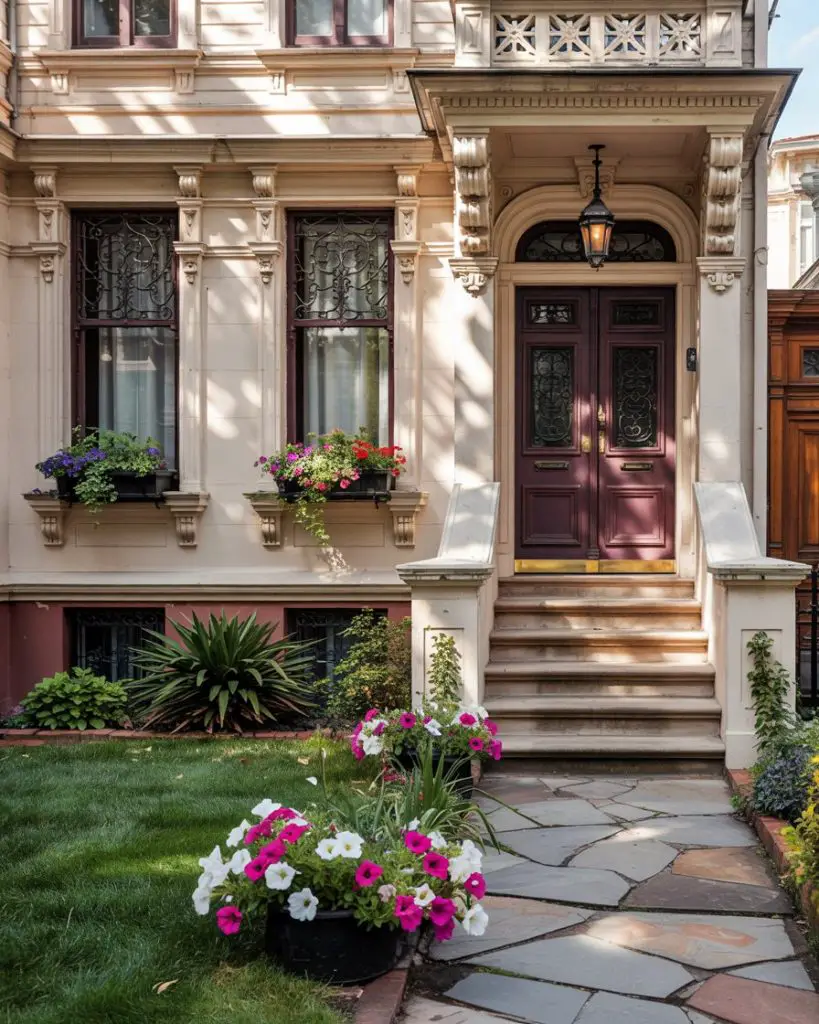 A purple front door is undeniably bold—a choice for homeowners who want their entry to spark conversation and stand out from the typical suburban palette. From deep eggplant to lavender, purple brings a creative, artistic energy that works surprisingly well on both traditional and eclectic homes. It’s particularly striking against white, gray, or tan exteriors, and it photographs beautifully for those Pinterest-worthy before-and-after reveals. Purple can also carry symbolic weight, often associated with creativity, luxury, and individuality.