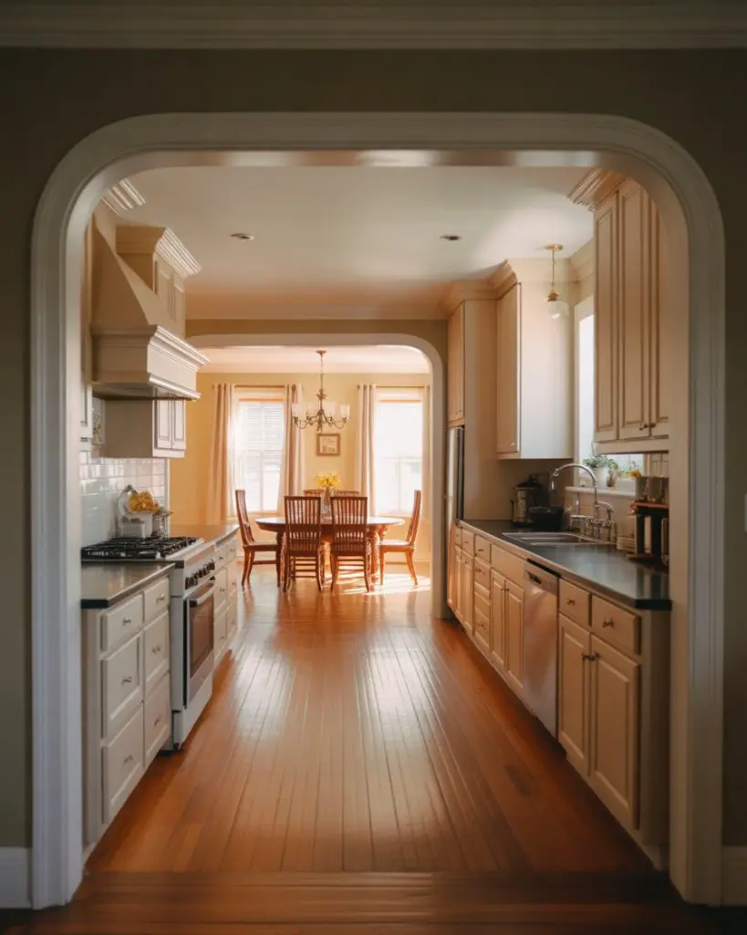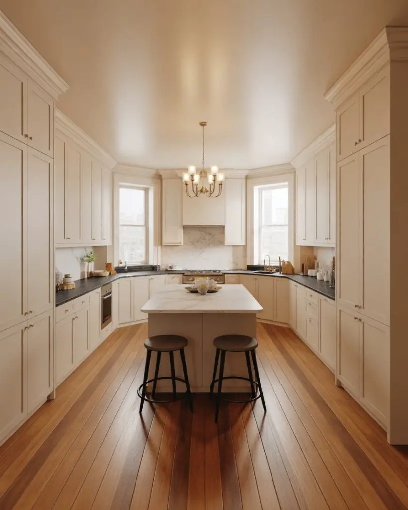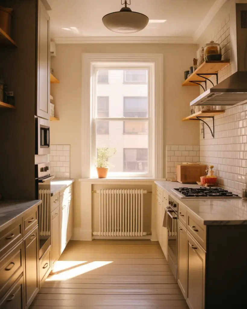 A white galley kitchen feels timeless and expansive, especially when paired with polished marble countertops that catch natural light. This layout works beautifully in older homes undergoing a remodel, where maintaining original proportions while modernizing finishes is the goal. Clean lines and reflective surfaces make even narrow spaces feel open and airy, giving you that magazine-worthy look without sacrificing storage or prep area.