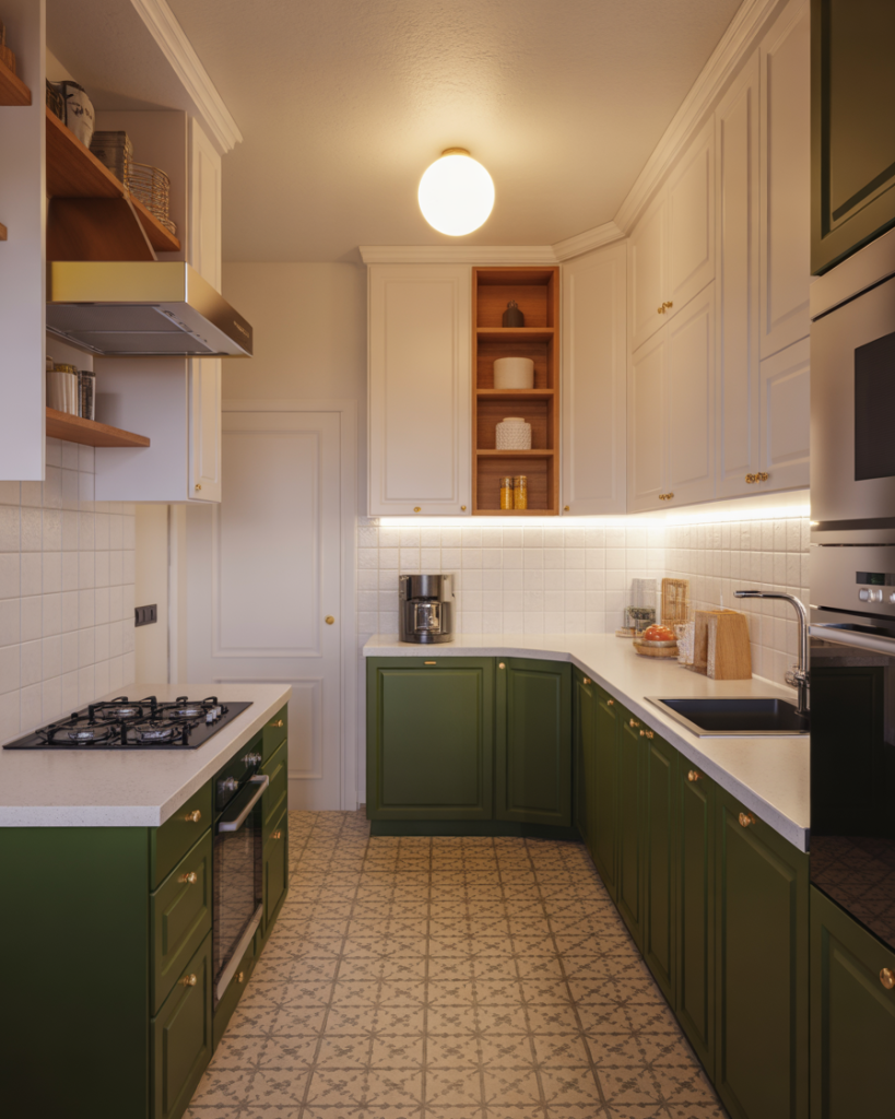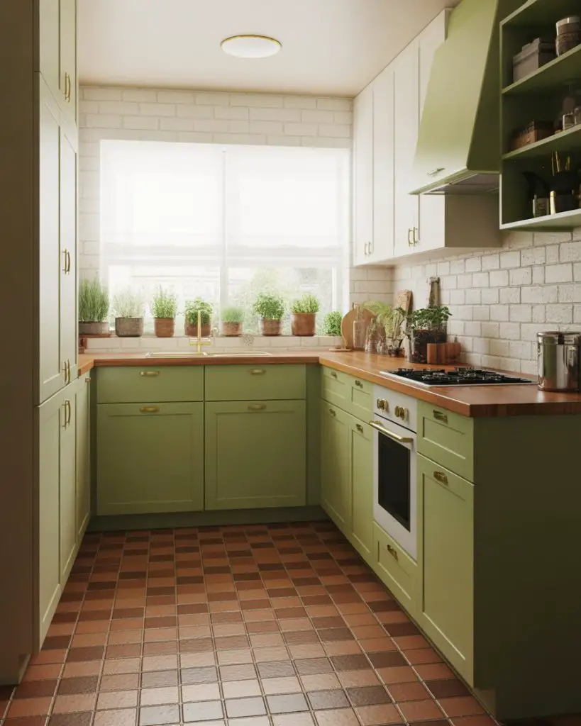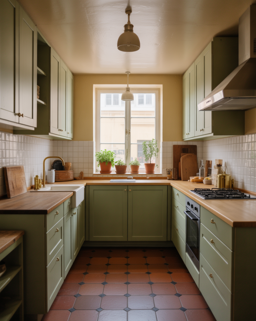 A green galley kitchen embraces biophilic design through sage cabinets, forest-toned tiles, or olive-hued walls that bring the outdoors inside. This remodel ideas approach pairs beautifully with natural wood countertops, rattan light fixtures, and plants on open shelving. The color palette creates a calming atmosphere that makes time spent cooking feel restorative rather than rushed.