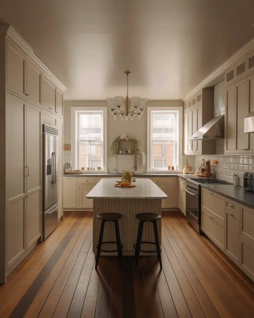 Where it works best: This setup shines in Victorian-era townhouses and pre-war apartments where architectural charm meets modern living. The white palette enhances original moldings and tall ceilings while the galley format respects the home’s original footprint, avoiding costly structural changes that can blow your budget.