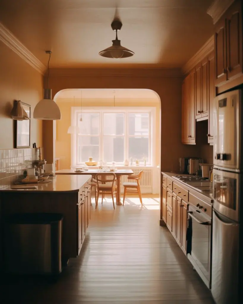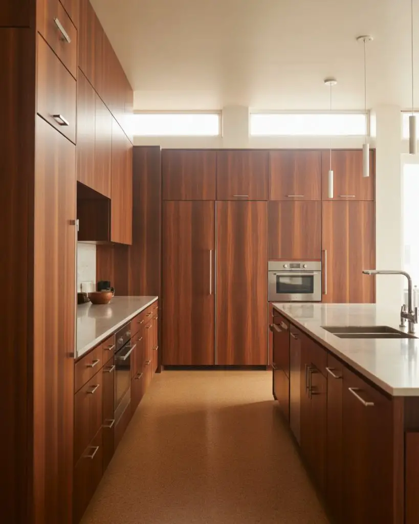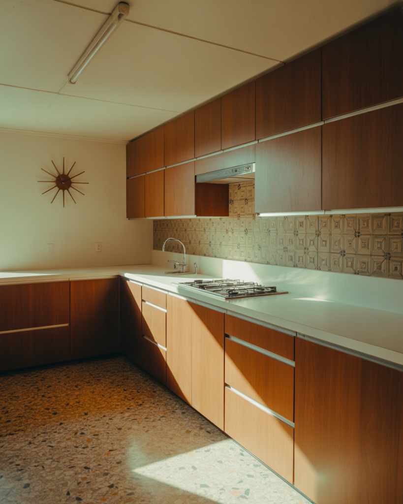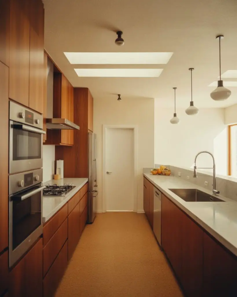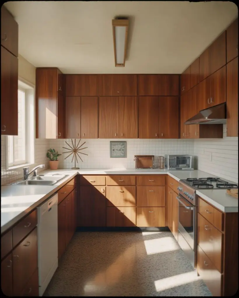 Where it works best: The Southwest, California, and Pacific Northwest have the highest concentration of preserved mid-century homes where this aesthetic feels authentic rather than themed. The galley format was extremely common in 1950s-60s construction, so you’re often working with original layouts that just need sensitive updating.