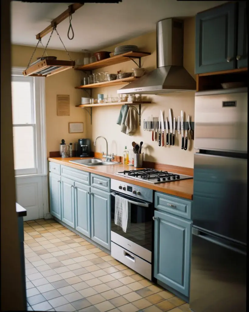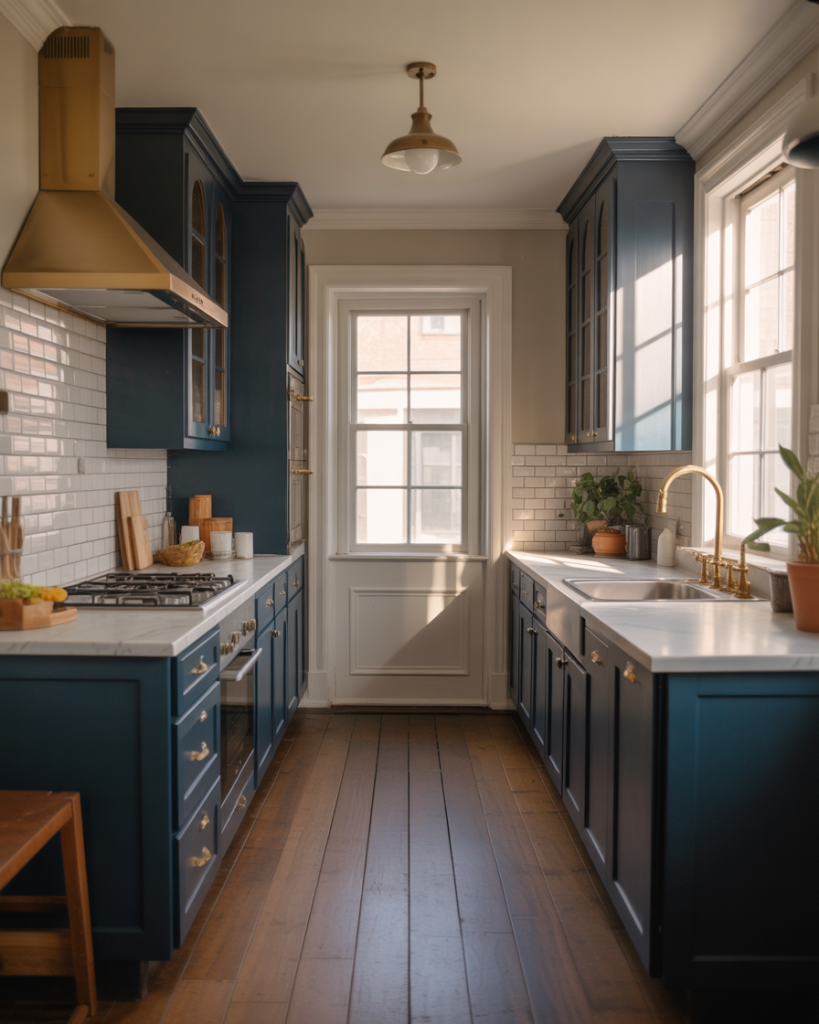 Rich blue cabinets—from navy to powder to slate—bring sophistication and versatility to galley kitchens in both coastal and traditional settings. This layout pairs beautifully with brass or nickel hardware, white countertops, and natural wood accents. Blue reads as neutral enough for long-term appeal while offering more personality than standard white or gray.